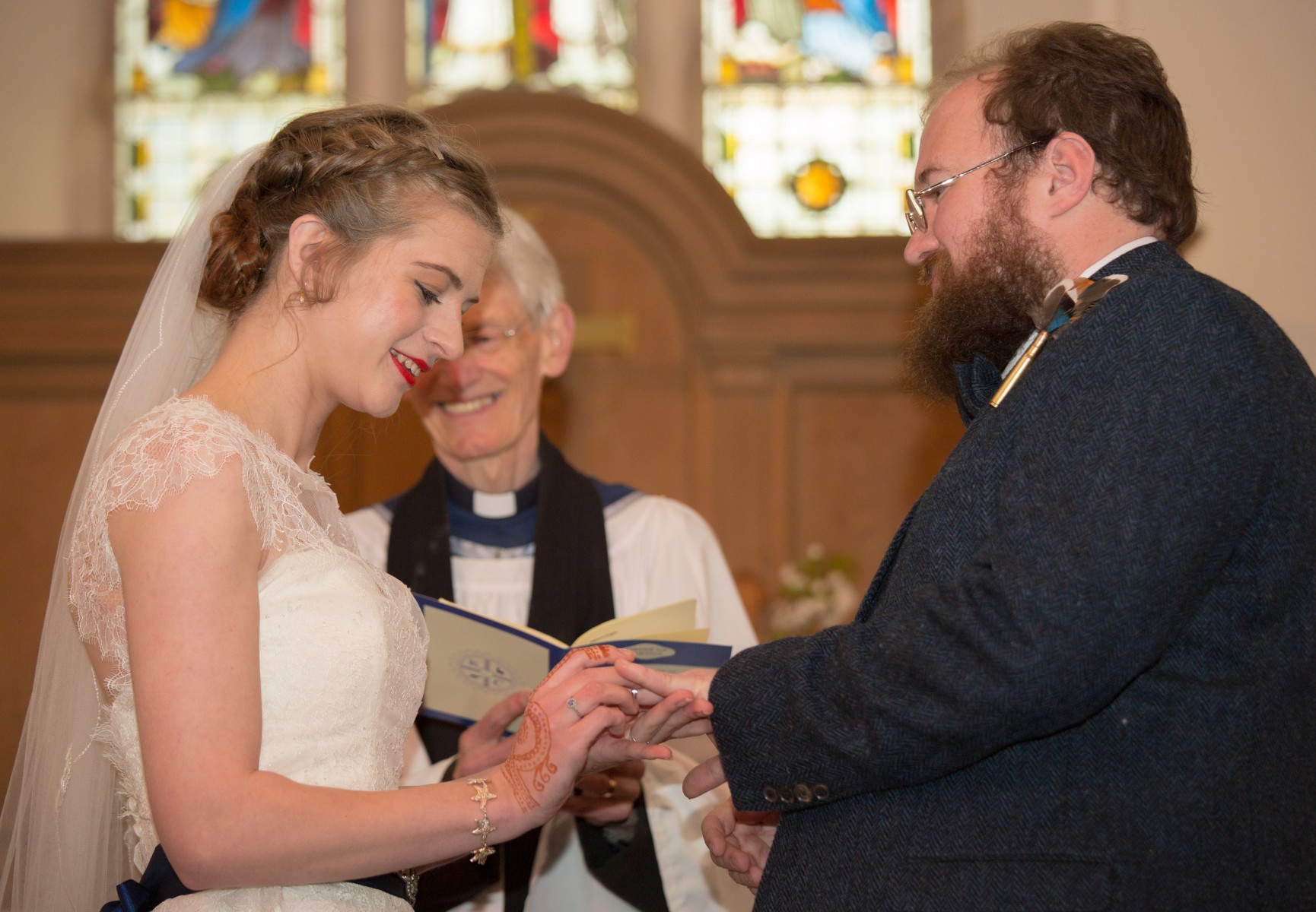 This tipi wedding is full of lovely personal touches, like the embroidery on the inside of Kyle’s hat. The owl was a fab addition too! The couple even blew up their wedding cake with their very own cannon- how badass! We love Clara’s bright yellow wellies, and how she’s added a bold necklace to her bridal look.