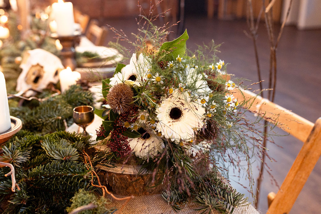 Flowers by Lottie Roberts Flowers included daisies which are traditional in Viking weddings and plenty of foliage and branches to keep everything natural.