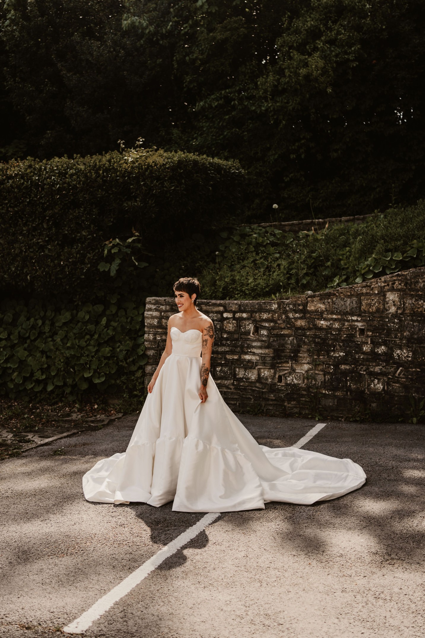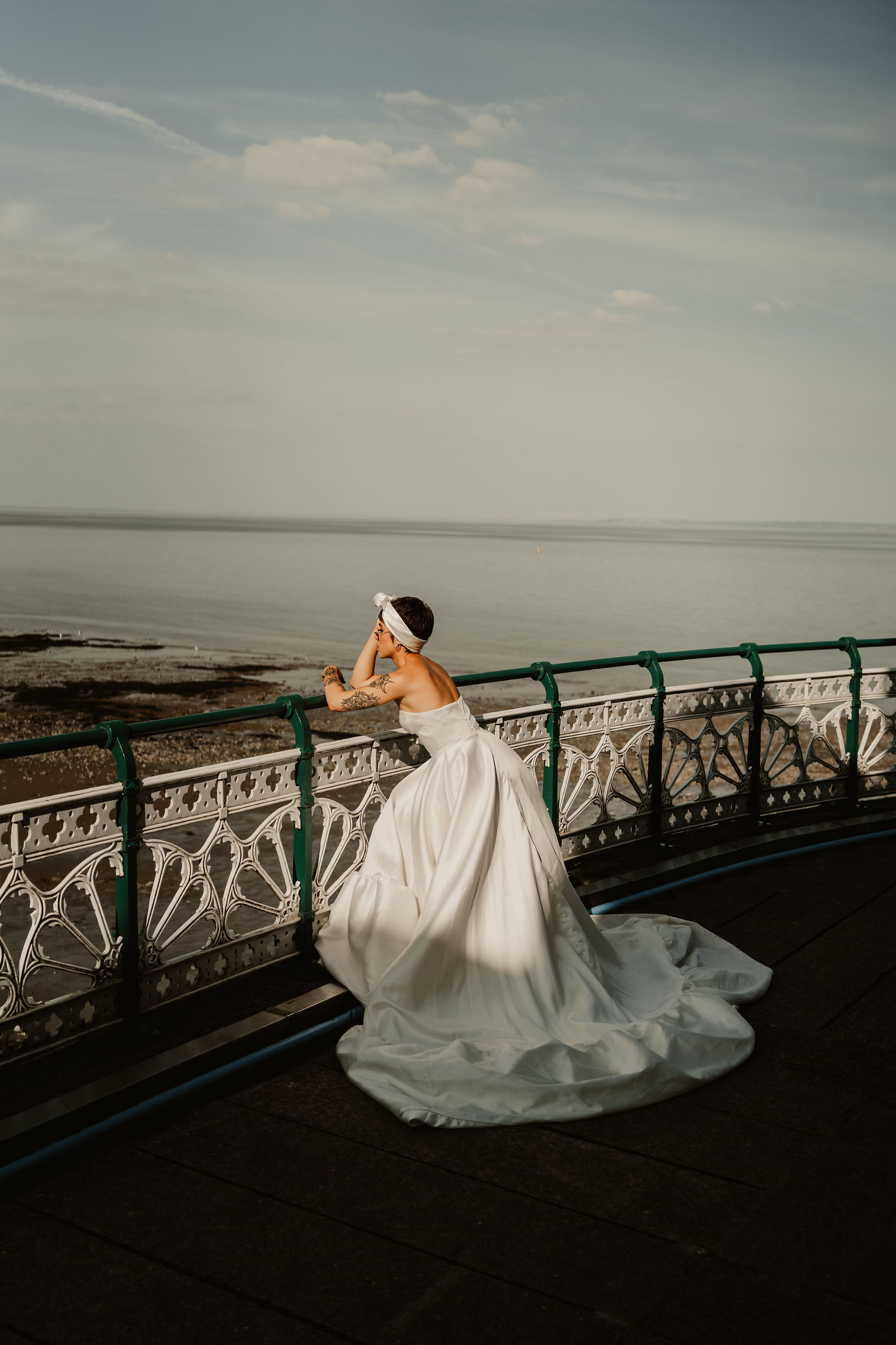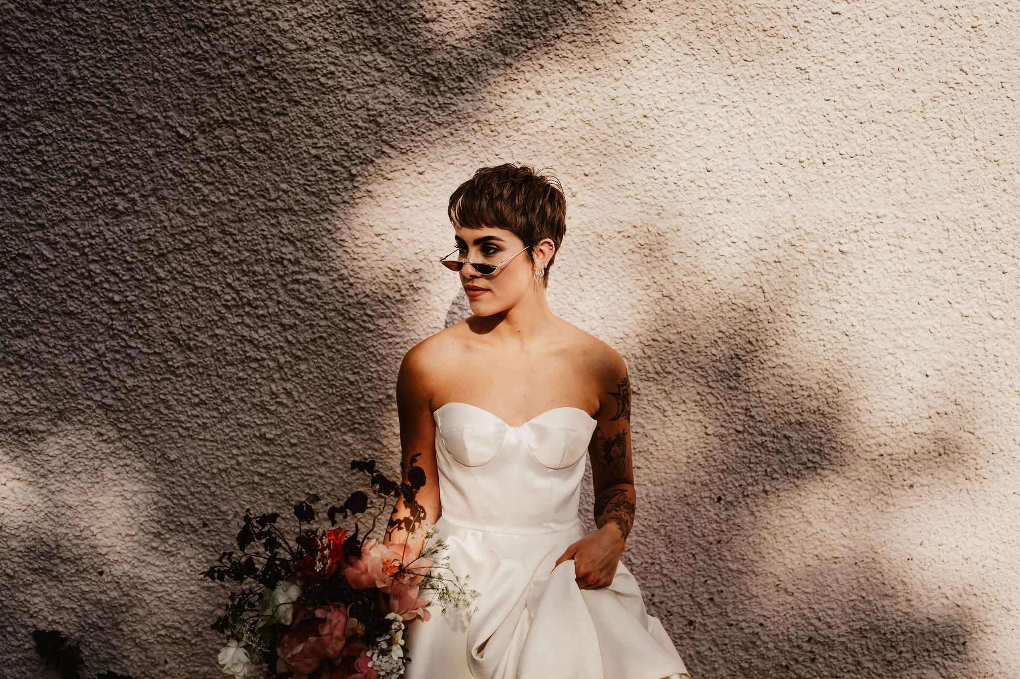 This bridal look is BEAUTIFUL! Model Liv Pixie is absolutely glowing in E and W Coutureβs Madison gown, with hair and makeup by Pixie Hair Company. Weβre suckers for a good wedding accessory and this bride is rocking it with sunglasses and a headband adding personal touches to the look.Β