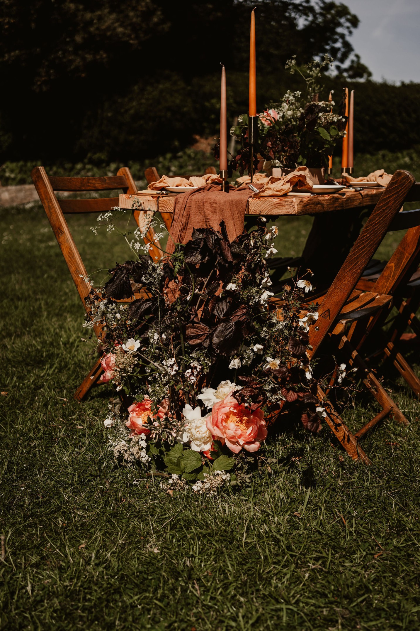 Use seasonal flowers wherever possible. Weβre loving the natural feel of the table linens, and boho wedding stationery.