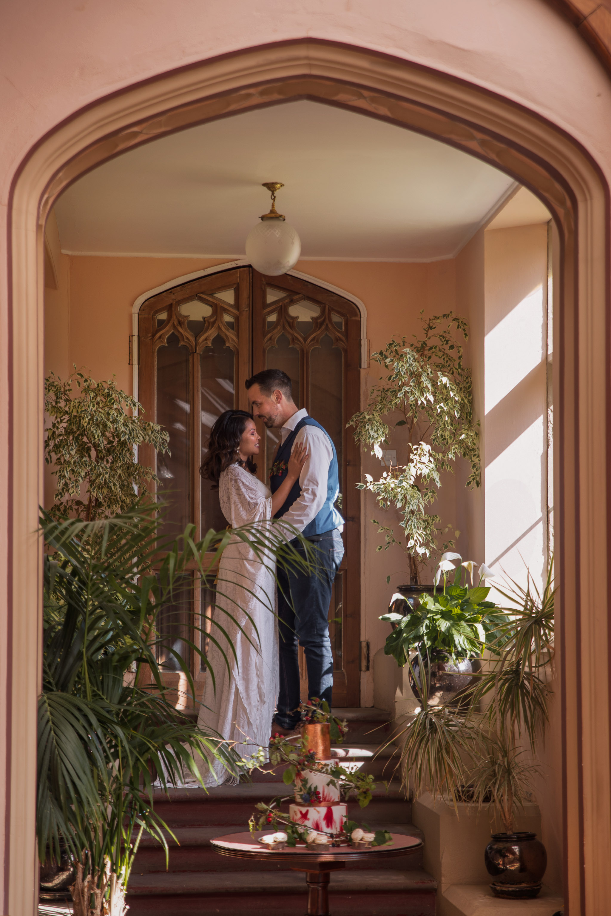 Part of this autumn sunset wedding shoot took place in the breath-taking Cressbrook Hall. What a unique venue it is, with its stone buildings nestled amongst the contrasting landscape and dramatic geology near Bakewell. Finishing Flourishes styled the venue with lots of foliage, bringing the nature inside. They also created the large statement bouquet, using wild berries and autumnal stems.