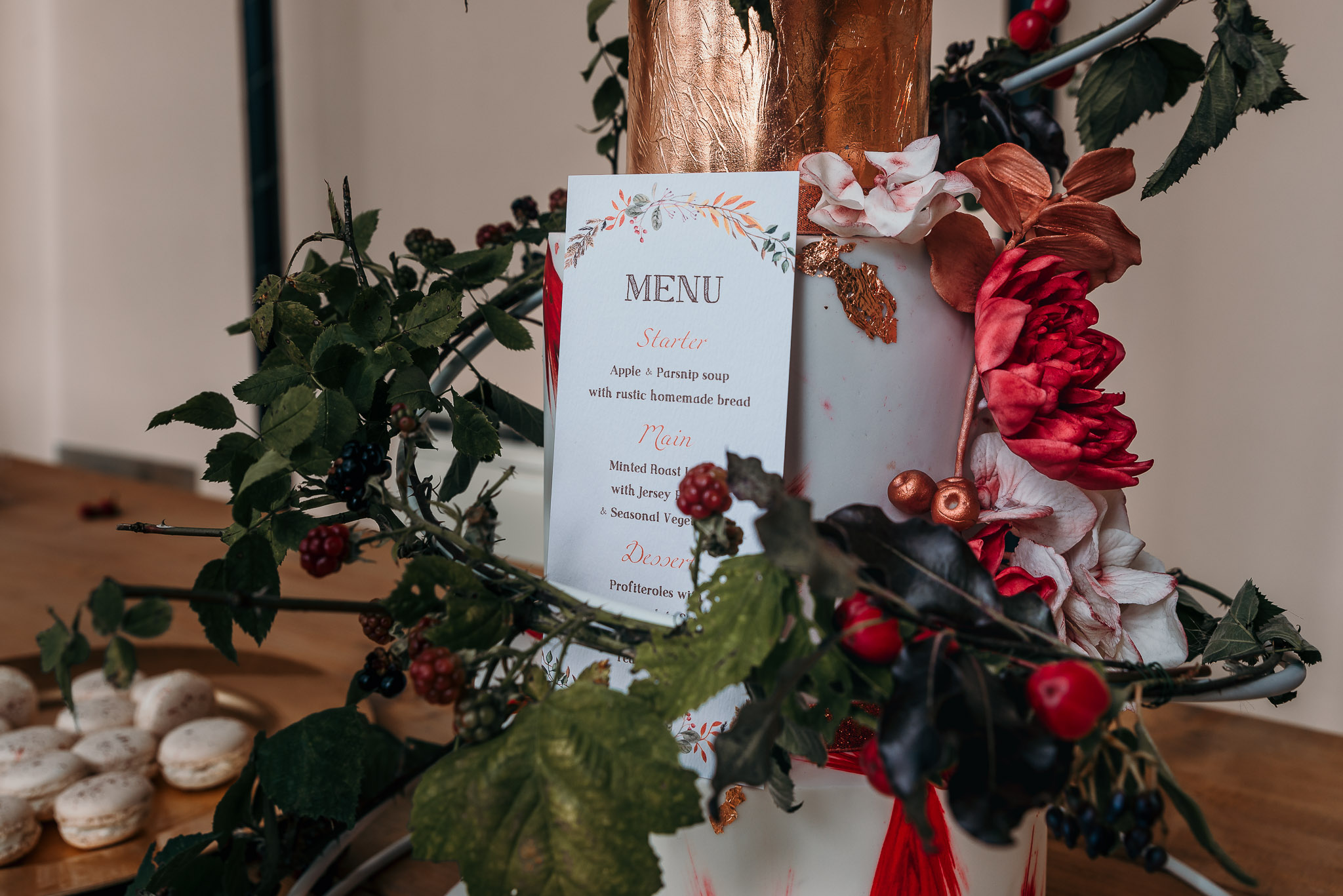 Weโre loving the autumn vibes from this wedding cake by Urban Cakehouse! It looks brilliant draped in foliage with bold red florals.