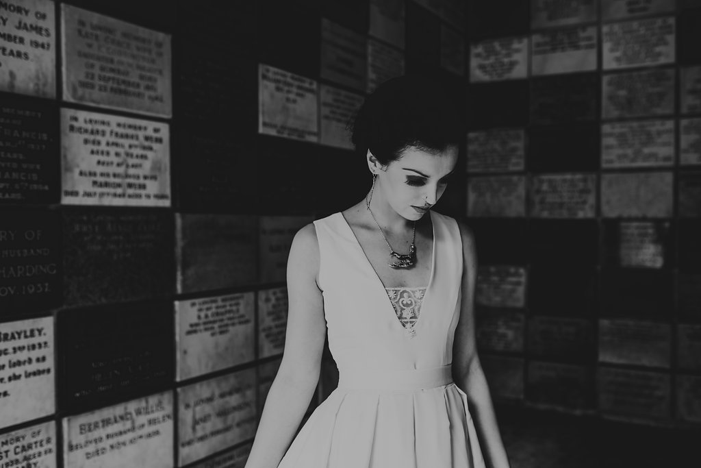 “My favourite photo … has to be our gorgeous tattooed bride Hayley in her veil. The shot is so hauntingly beautiful, and I feel so drawn to the image. It gives me chills and heart flutters – she looks like a gorgeous bride at the same time as looking like a ghostly figure. It matches perfectly with the venue we were privileged to shoot in as itβs both a Cemetery and a wedding venue! “Chloe