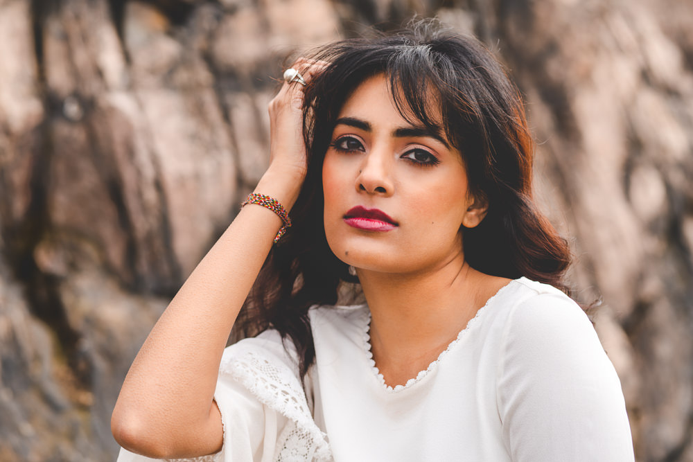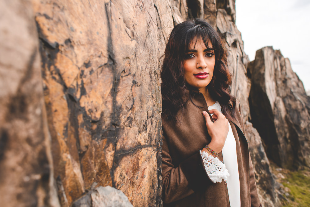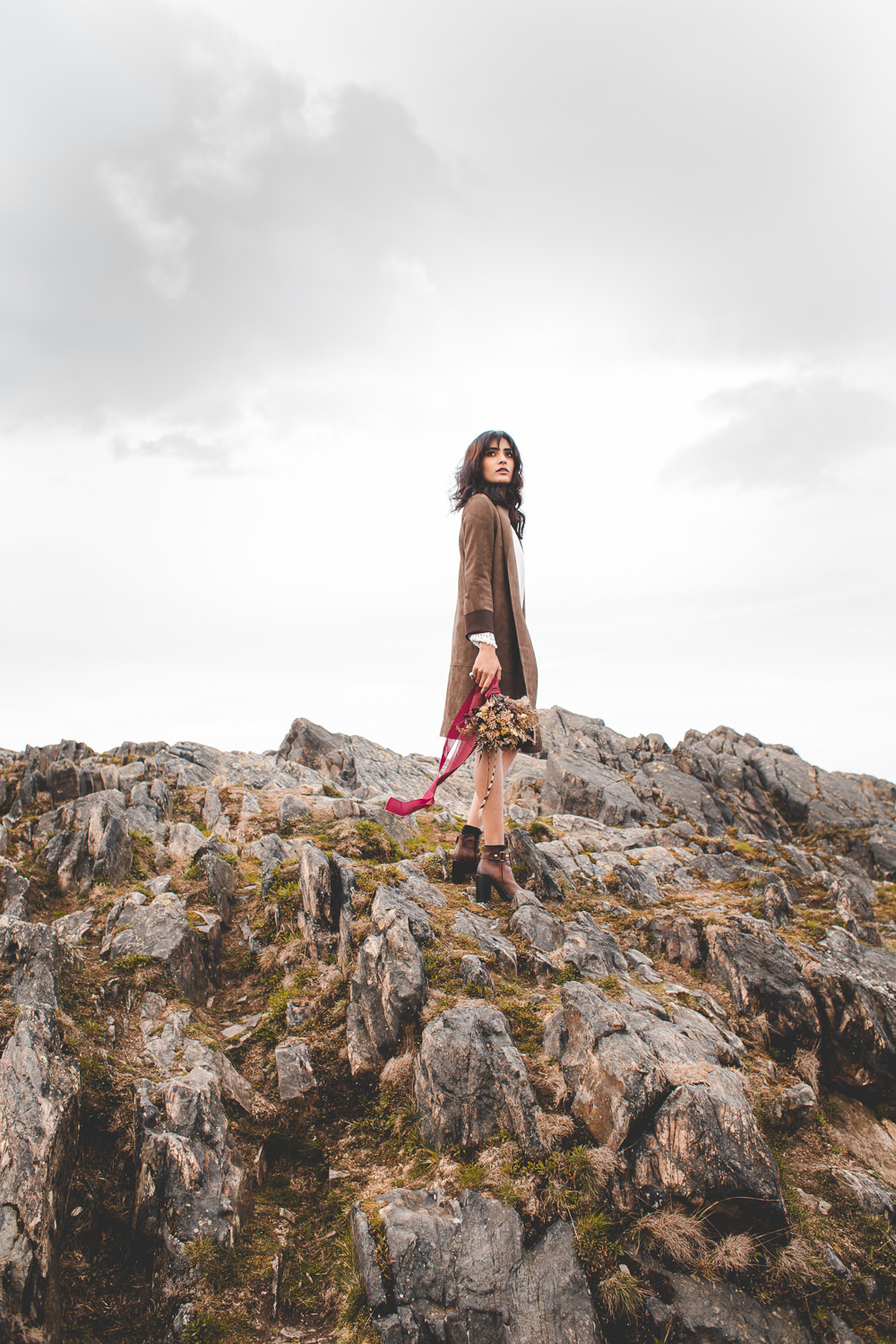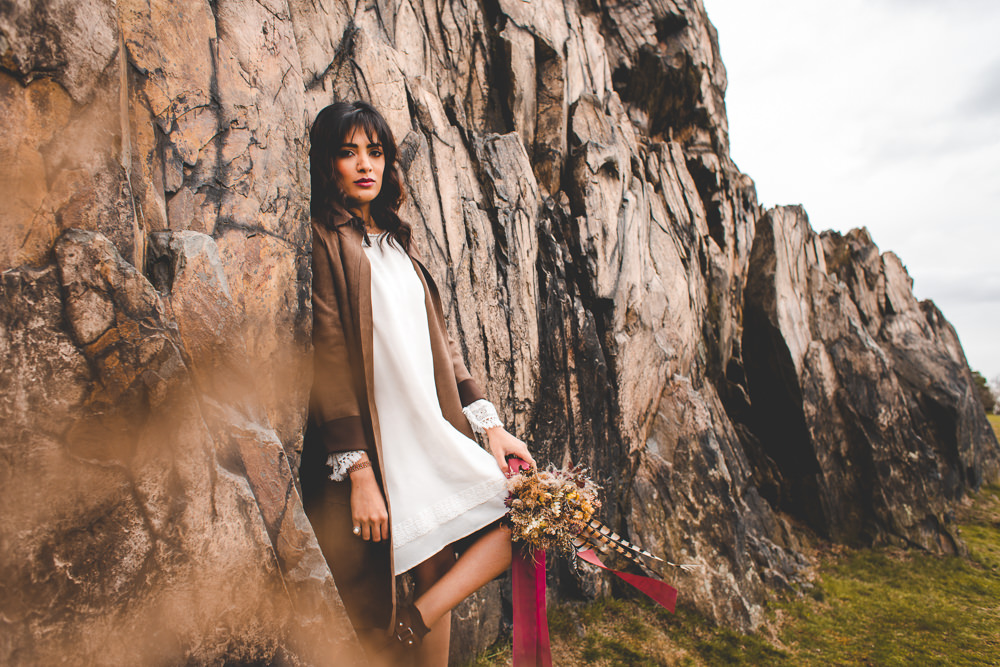 The shoot showcases the ‘Gabrielle’ dress by IndieBride London; a loose-fitting silk dress with long bell sleeves and lace trims, modelled by the stunning Chandni Supawala. Dressed down with a brown coat and leather boots, the bride looks stylish yet comfortable- you can’t climb rocks in stilettos! The wedding makeup, by Strong Brides is natural and radiant with a warm splash of colour on the lips to match the bouquet.