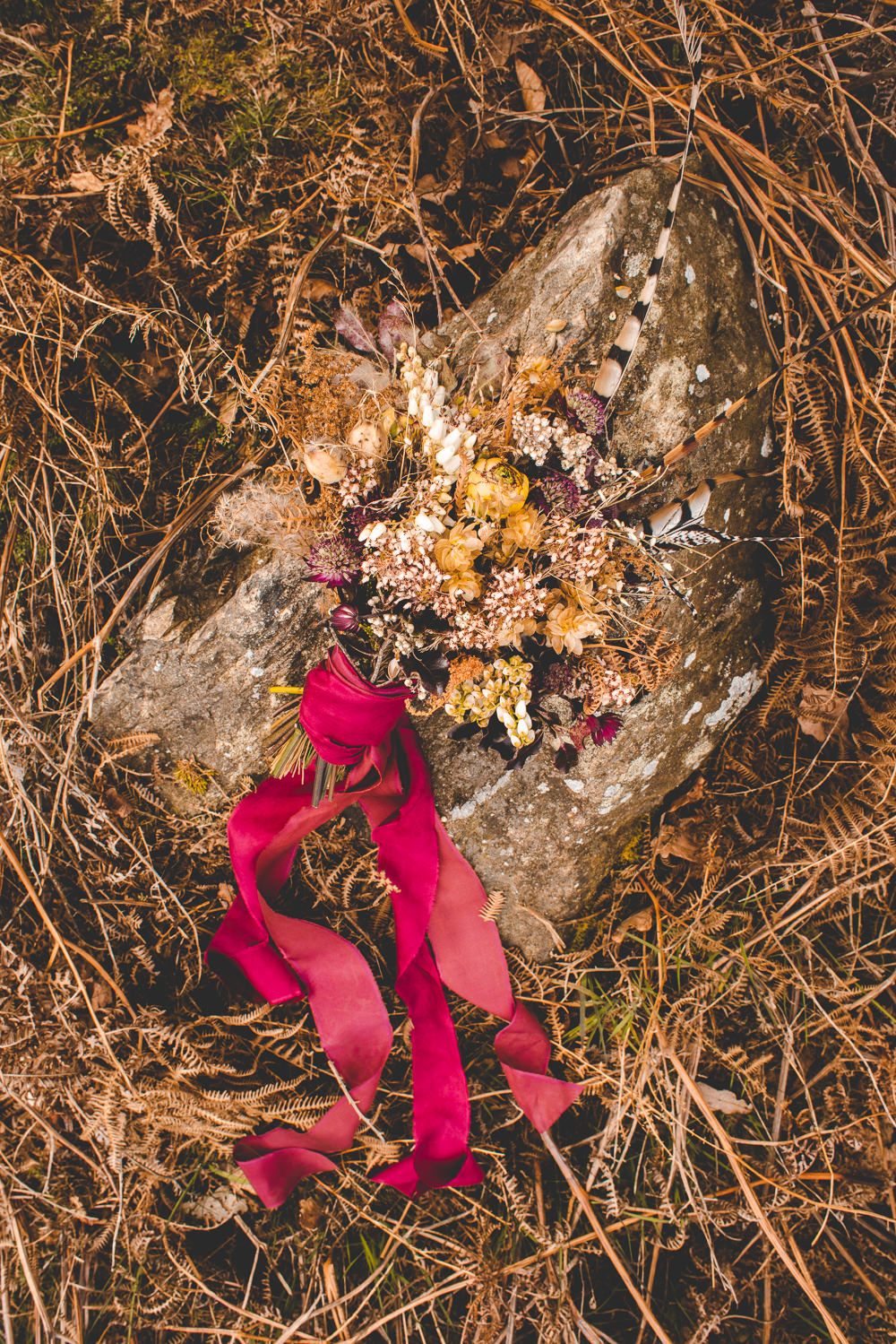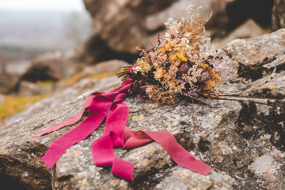 We adore this dried wedding bouquet by Pollen Floral Joy, embellished with feathers and wildflowers. The muted colours match the rocky backdrop perfectly, with an understated beauty. The bouquet is held together by a raspberry, hand dyed, silk ribbon from Little Acorn Silks, left long to catch the wind and add a splash of colour.