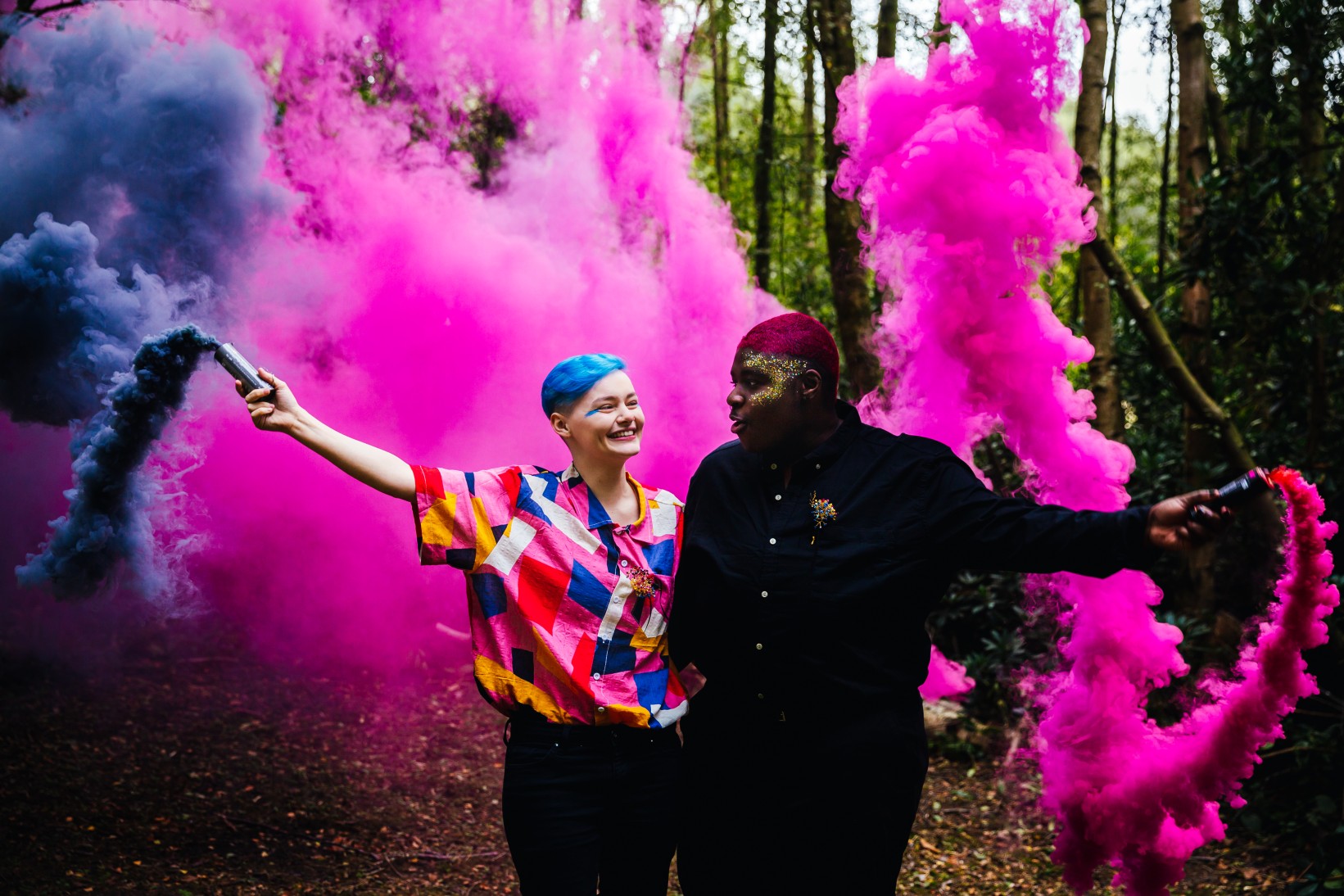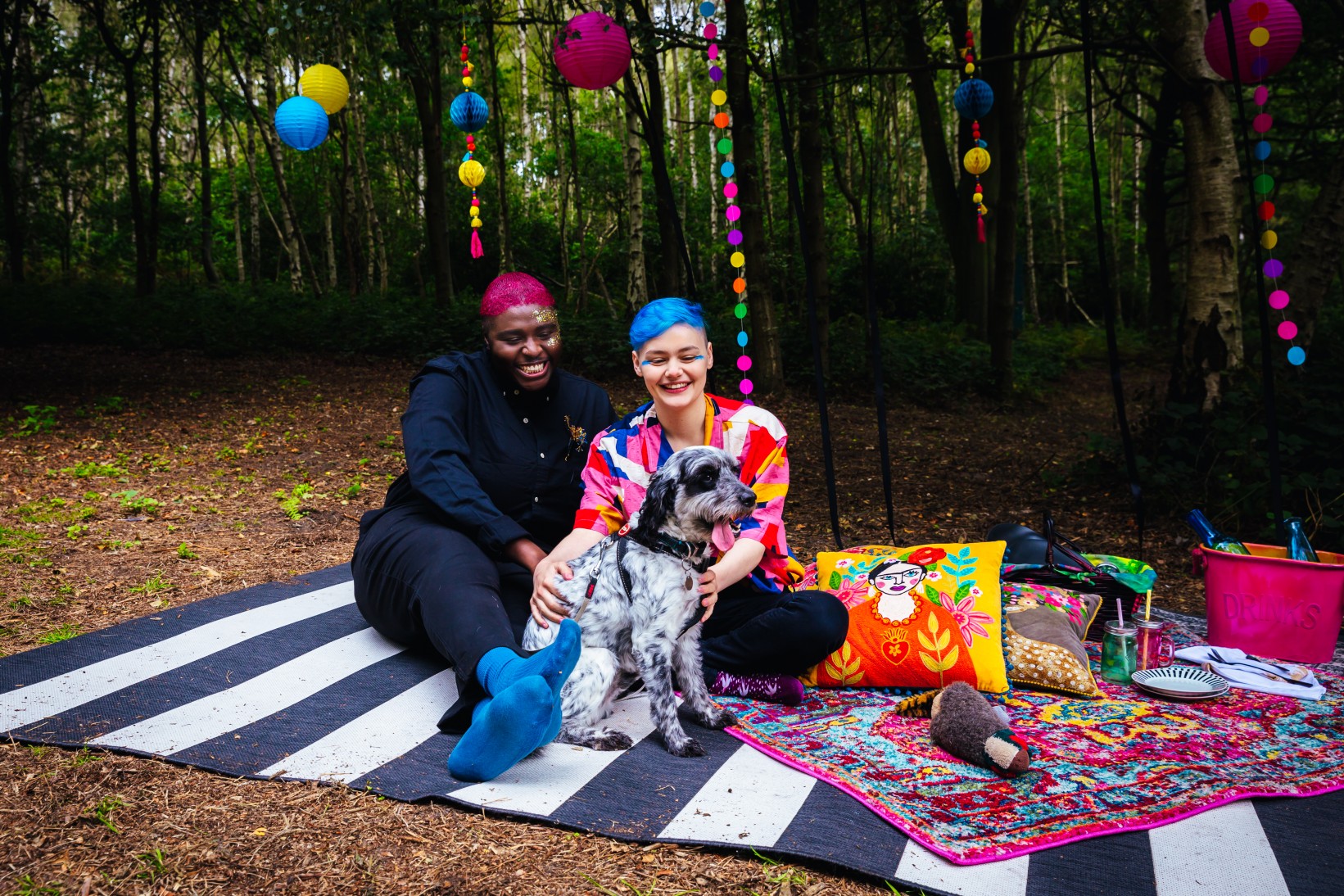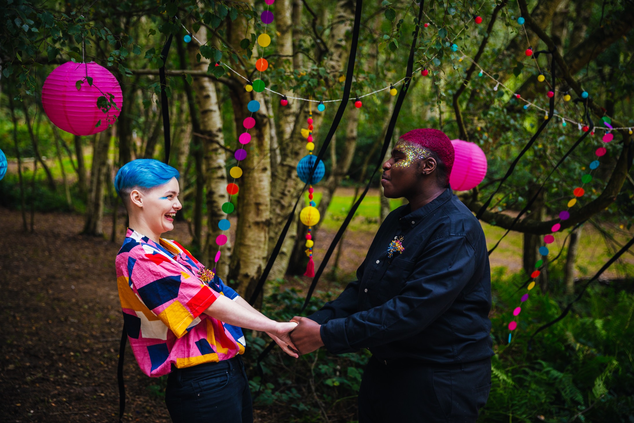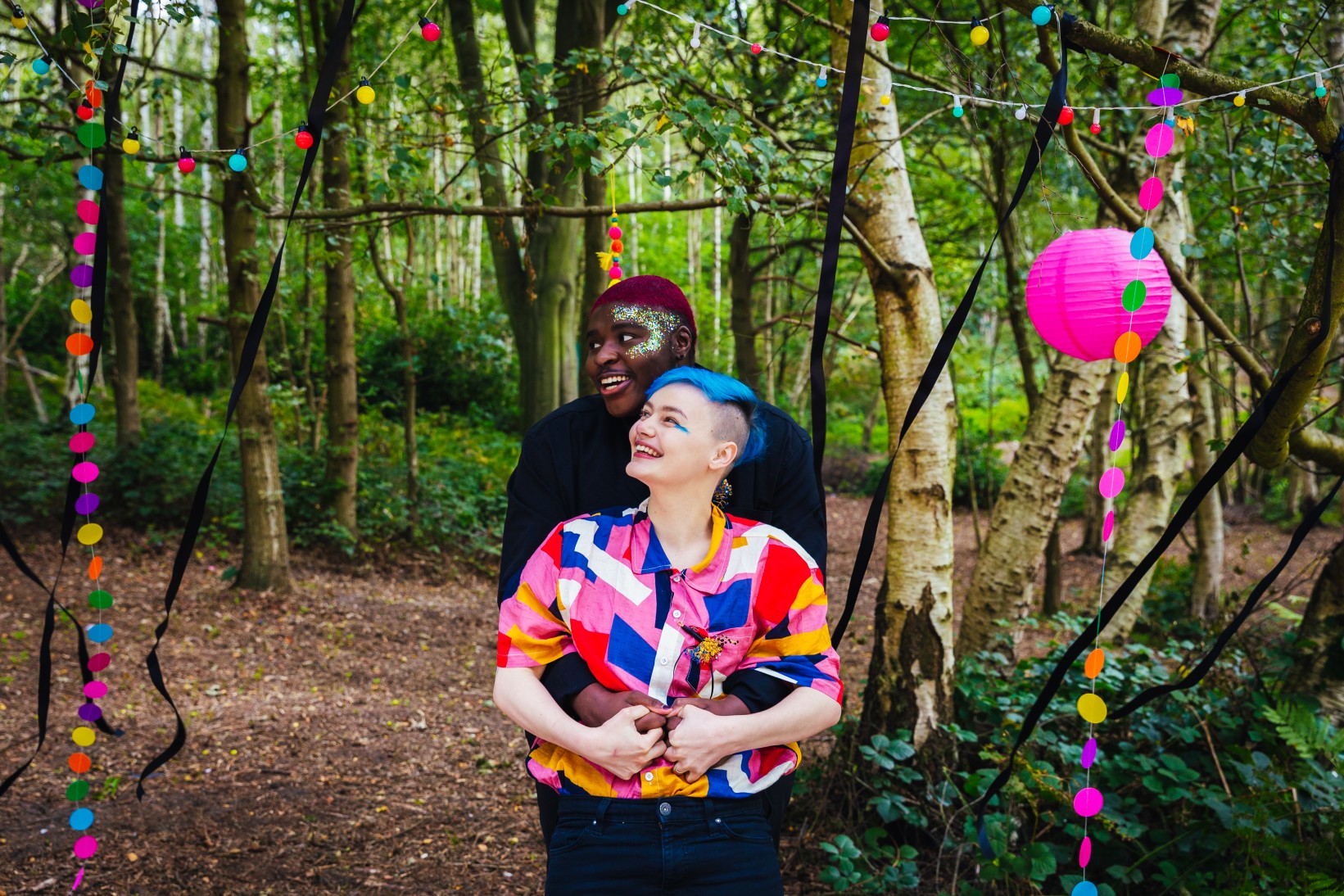 This colourful forest wedding was styled by Caz at The Wedding Alchemist. She’s a queen at using her alternative vision to really bring an idea to life. The colours pop so brilliantly against the backdrop of Sherwood Glade – a stunning alternative wedding venue on the outskirts of Nottingham. The untouched space is perfect for an outdoor shindig or a micro-wedding. One of their onsite tipis was decorated into a rainbow heaven for this pair to retreat to after their picnic!