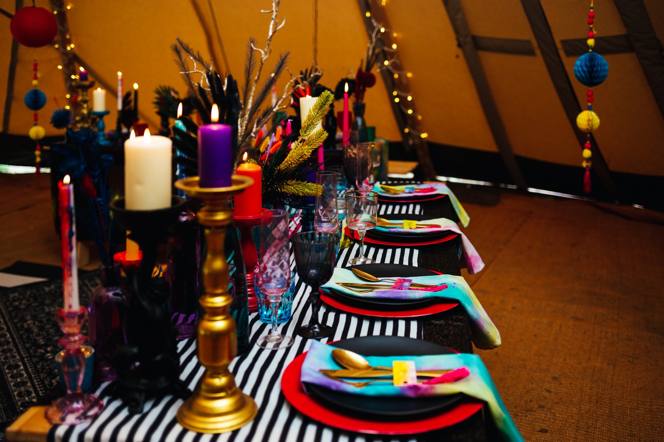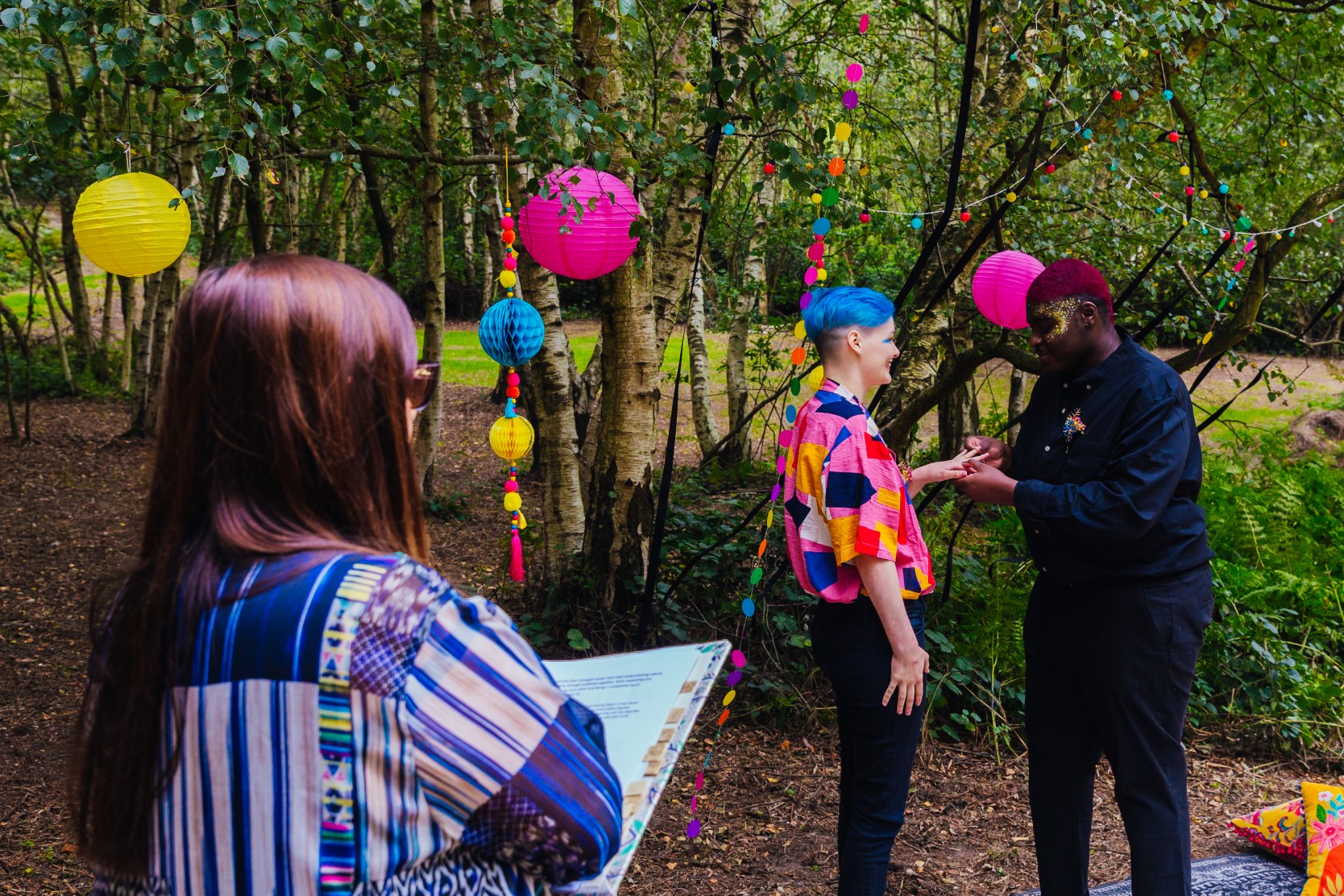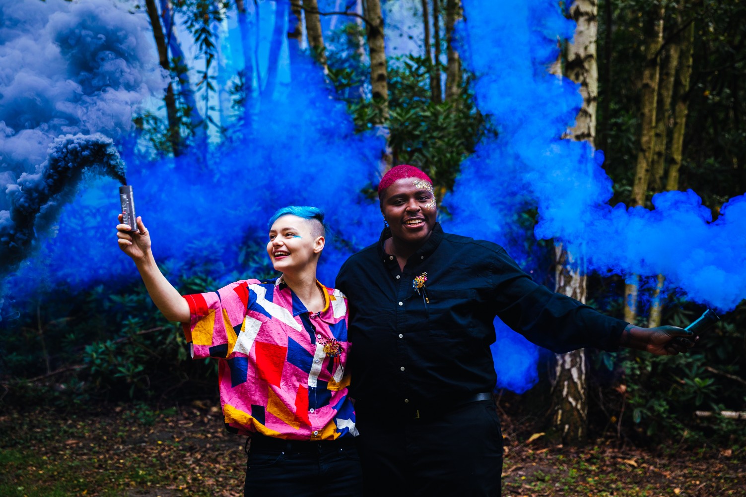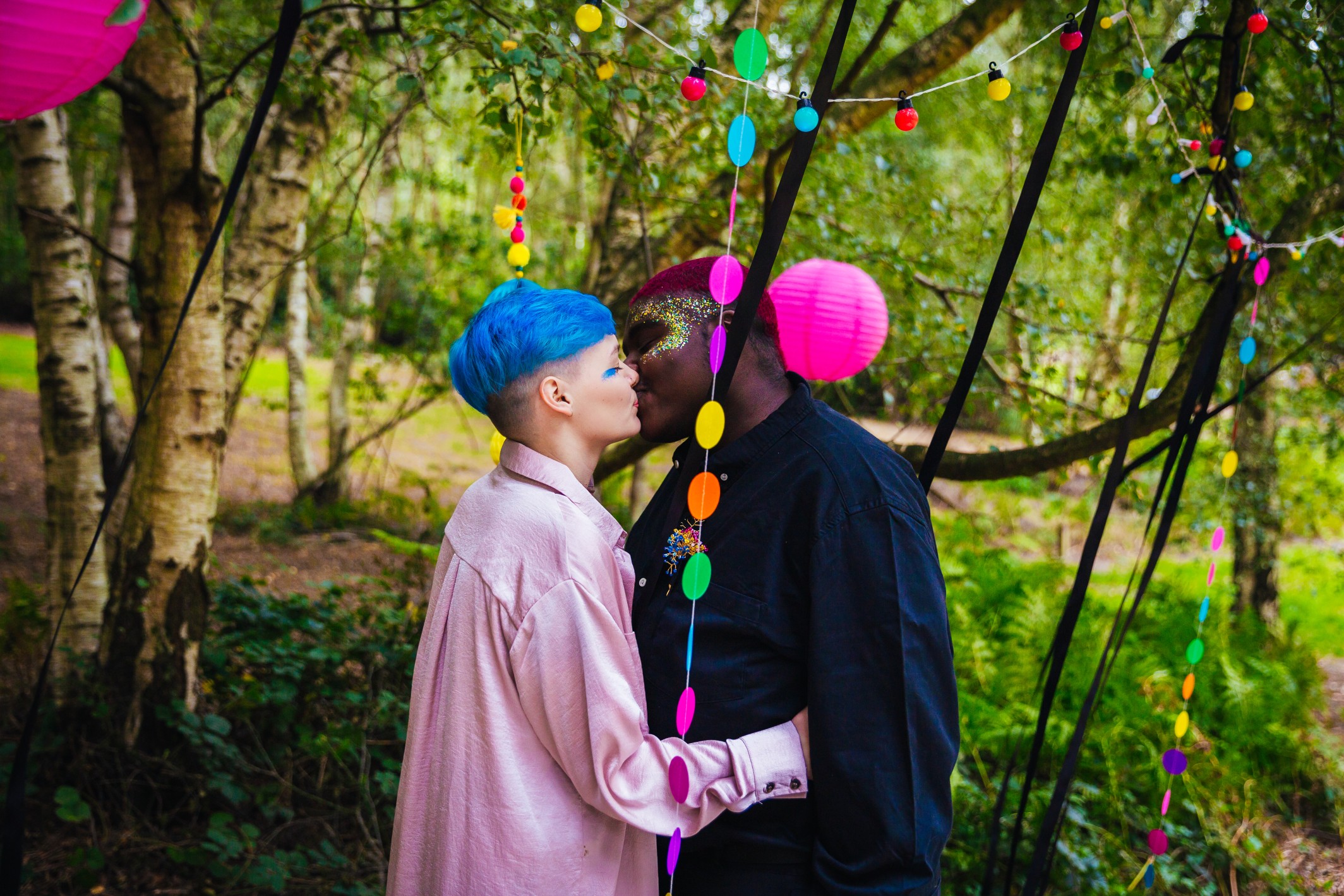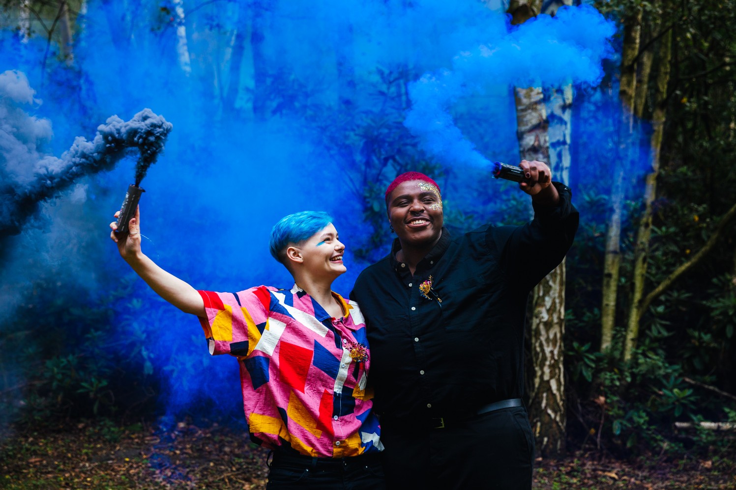 This colourful forest wedding was styled by Caz at The Wedding Alchemist. She’s a queen at using her alternative vision to really bring an idea to life. The colours pop so brilliantly against the backdrop of Sherwood Glade – a stunning alternative wedding venue on the outskirts of Nottingham. The untouched space is perfect for an outdoor shindig or a micro-wedding. One of their onsite tipis was decorated into a rainbow heaven for this pair to retreat to after their picnic!