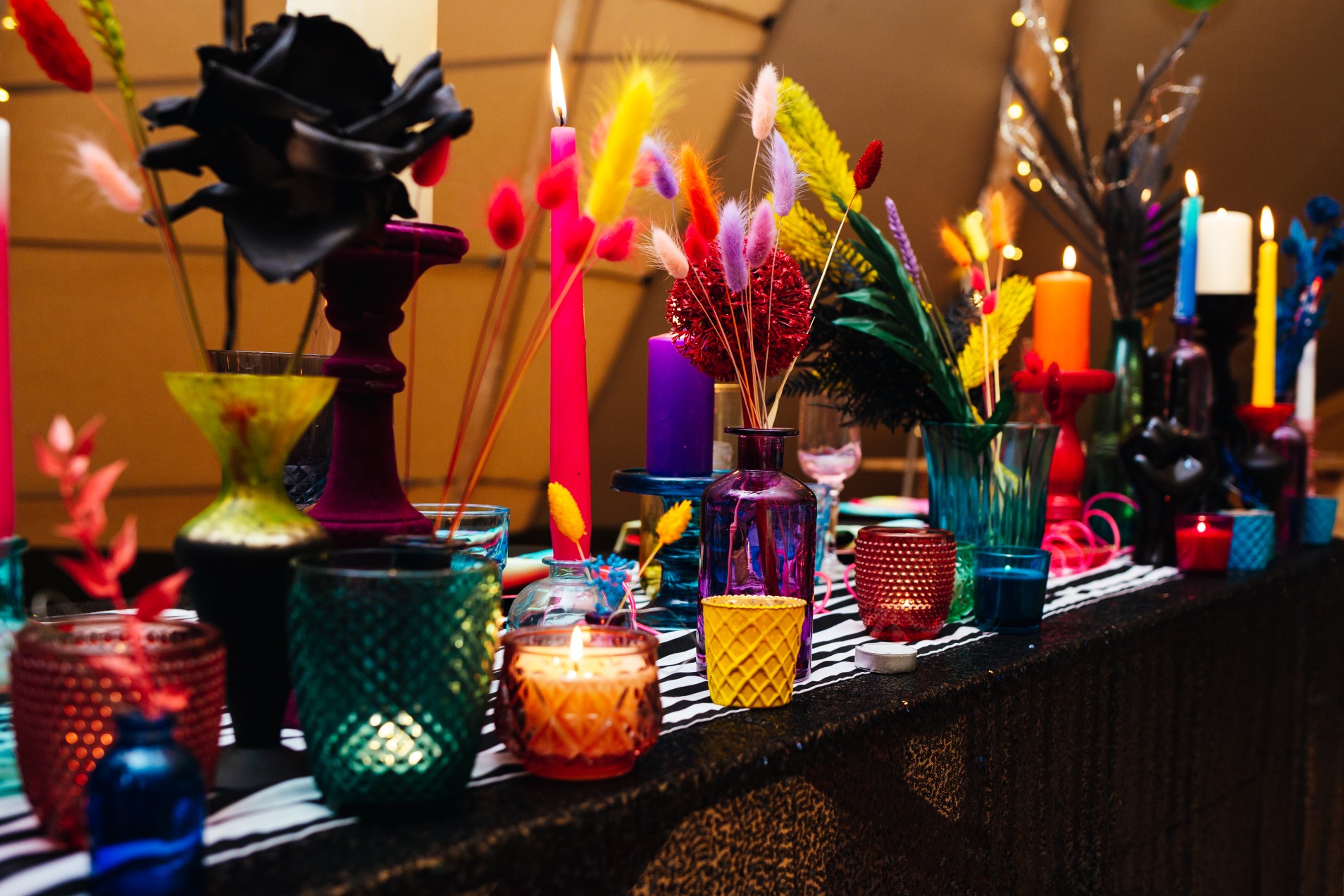Using black can add a quirky edge to your colourful wedding. It makes the colours pop and adds depth. It can even balance out a busy color palette.