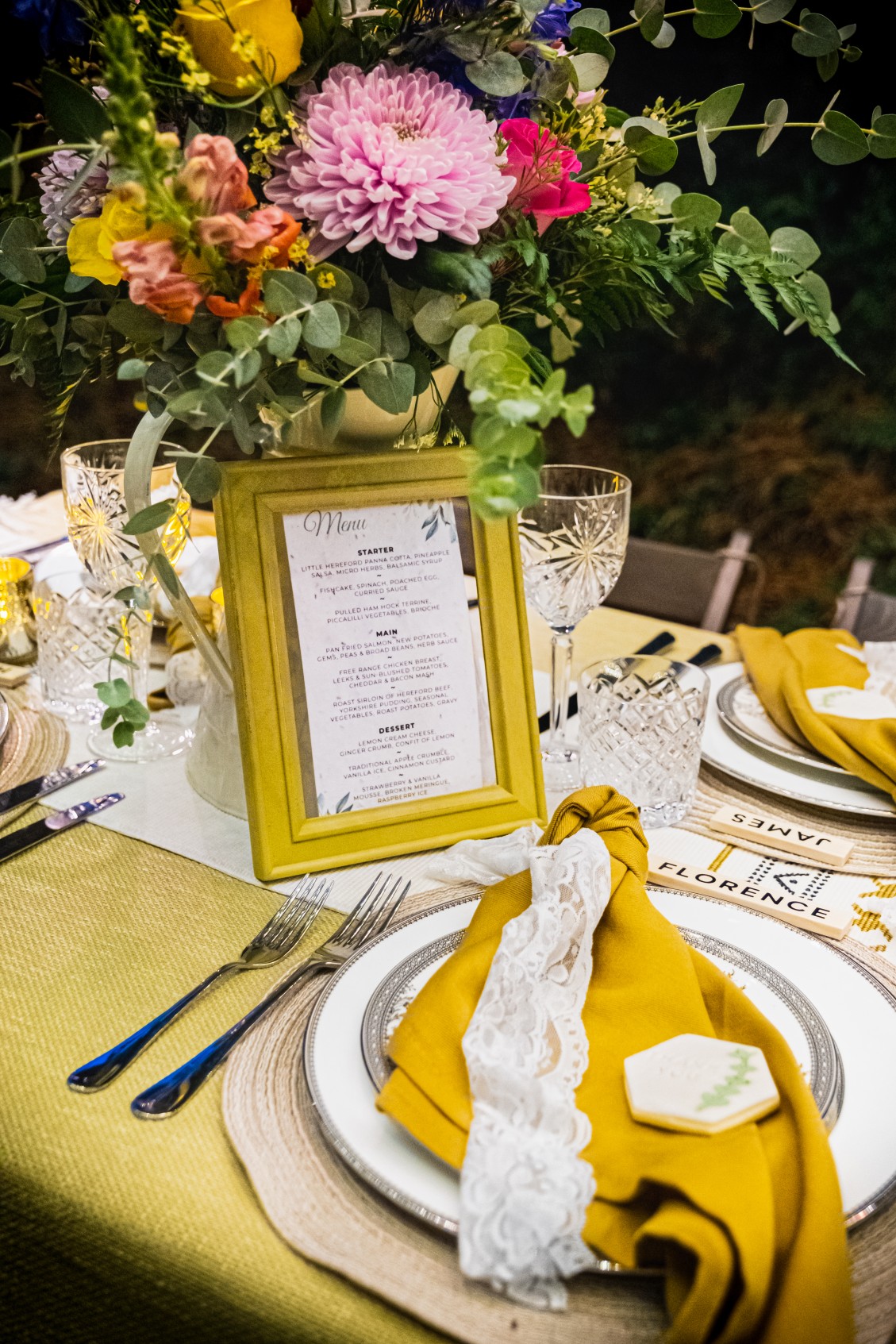 We love how this shoot blends bohemian spirit with a touch of elegance and luxury. Angela from Blossoming Events is an βon the dayβ co-ordinator and organised this colourful micro wedding, bringing the suppliers together and creating the design concept. Angela dressed the evening table, supplied the plants for the table plan and worked closely with the team to bring this vision alive! Scott, who is part of the Blossoming Team, worked with Radiance Production to design the lighting.Β