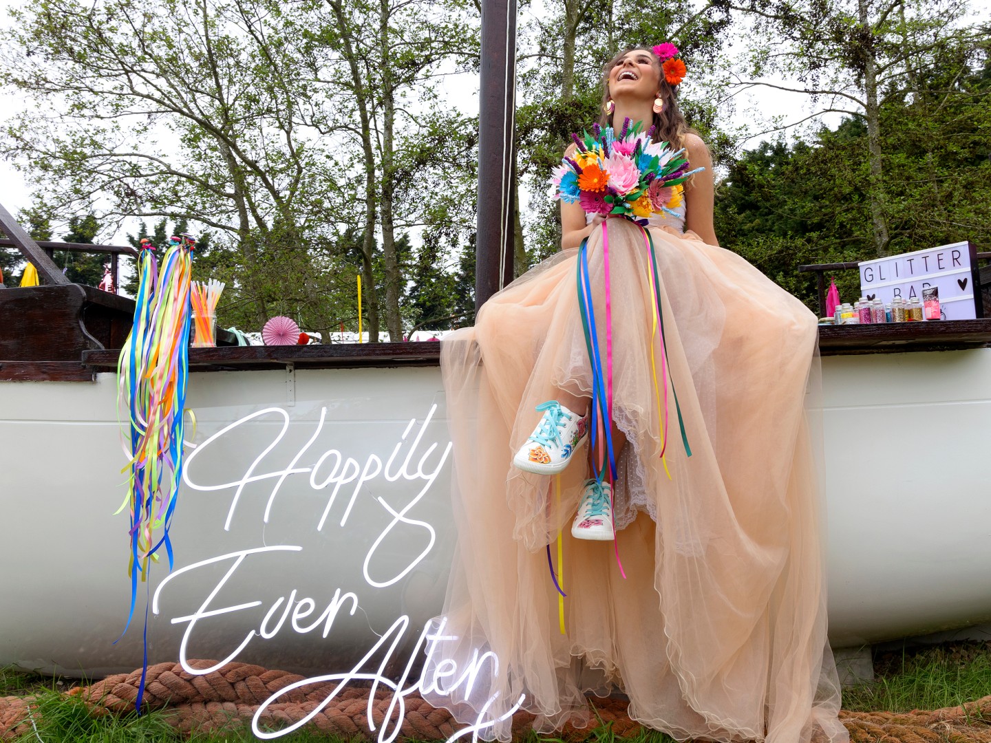 Smoke grenades, ribbons, lanterns, candy floss, glitter, fire breathing and a boat bar… What more could you want? This colourful summer wedding is full of Ibiza inspired festival vibes and we’re loving it! Pink Photographics sent us this epic inspiration and if we had to sum it up in one word it would be ‘JOY!’. Check it out below for bright colours and big smiles.