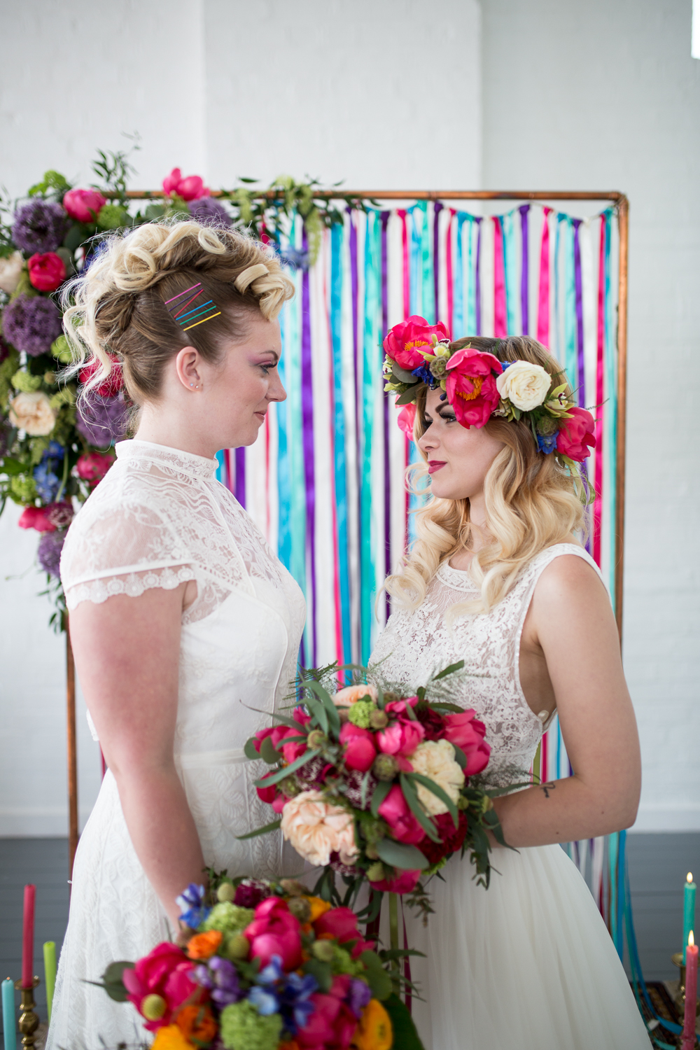 These Brides are rocking it in these wedding dresses from Bridal Boutique Of Jules. An edge is added to the look with these awesome jackets from Sammy Leas Retro Emporium and some classic Doc Marten boots. We love how a little bit of rainbow sneaks its way into the bridal hair (by Claire Hartley) with cute, colourful grips! The makeup is kept simple and classy by Ruth Ashcroft, again with little colour pops.
