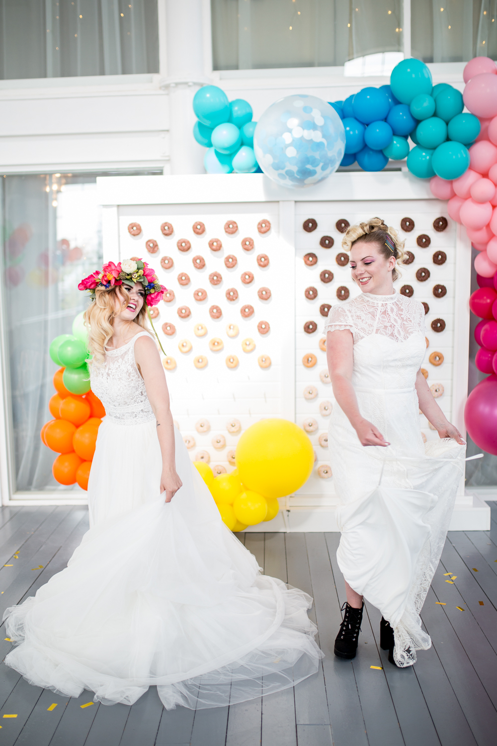 Today we have a super cool and colourful wedding shoot for you, captured by Florence Berry Photography. It features two kick ass brides, a mustang, a vintage ice cream tricycle, the UK’s biggest donut wall with an epic balloon installation! It’s set against the stunning Kent countryside and the stark white of The Winding House, a converted coalmine. It’s packed with fun and brightness, with a cool and fresh edge.