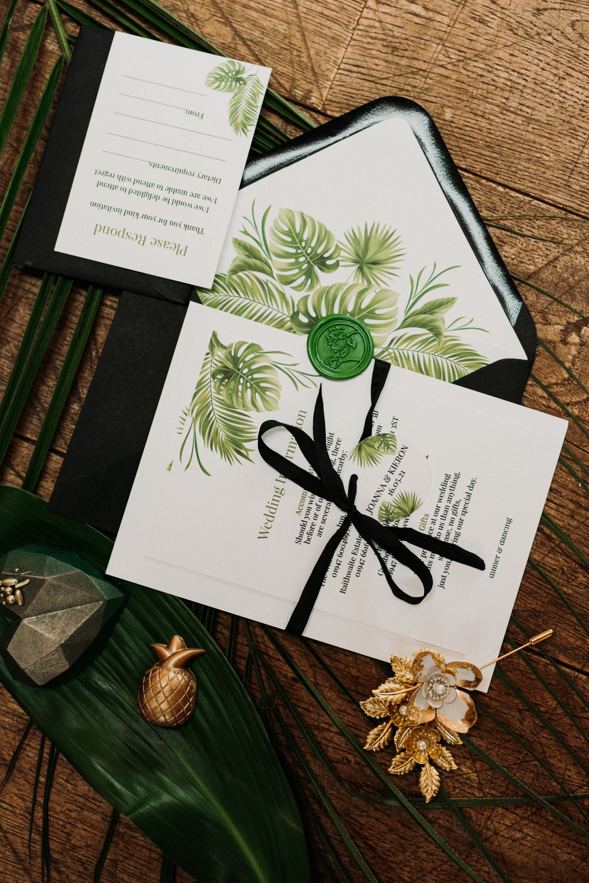 This dark tropical wedding uses a mostly black and green palette, with pops of bright coral to add the 'pazazz'. Play with having a strong accent colour!