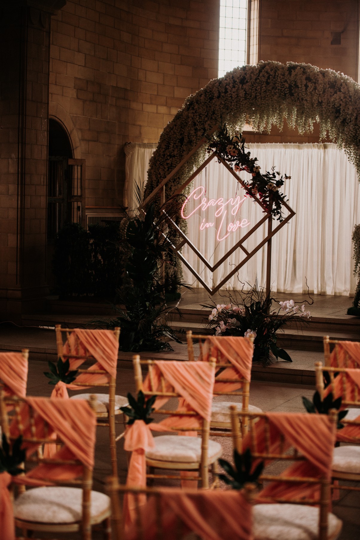 The neon signs from Smithys Events really added the WOW factor! Their geometric stand and neon pink lights created a beautiful, modern backdrop to the aisle. The funky lighting made for some epic wedding photos by Paylor Photography, too!