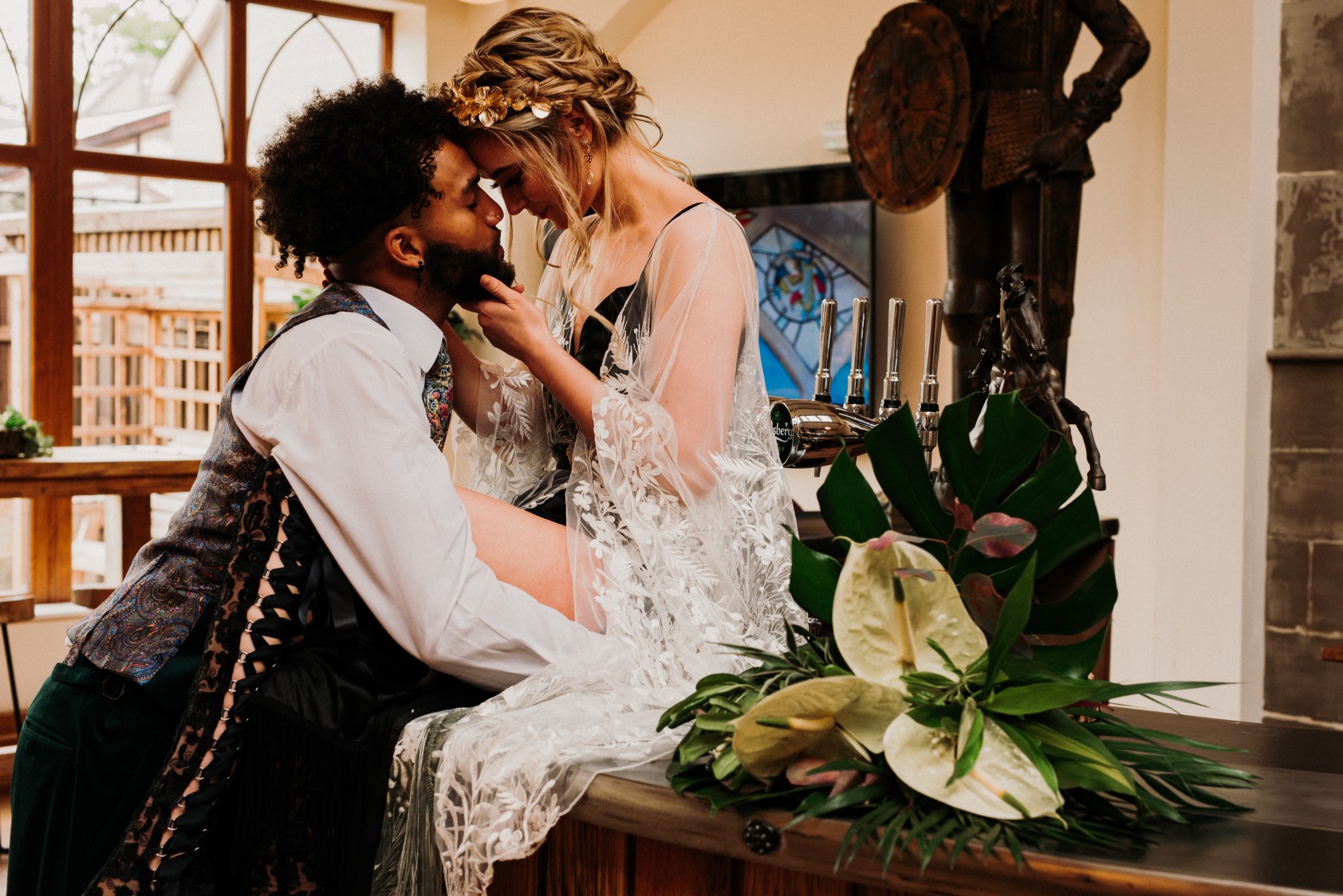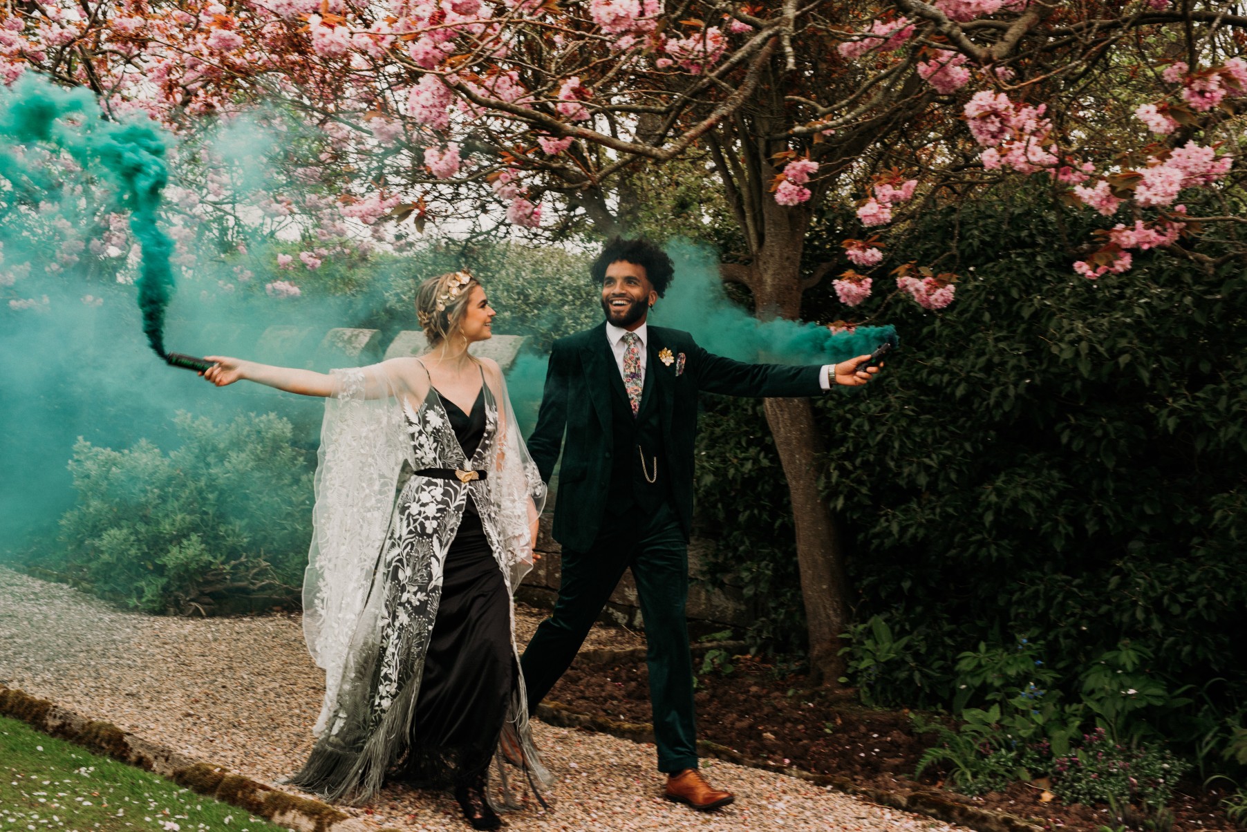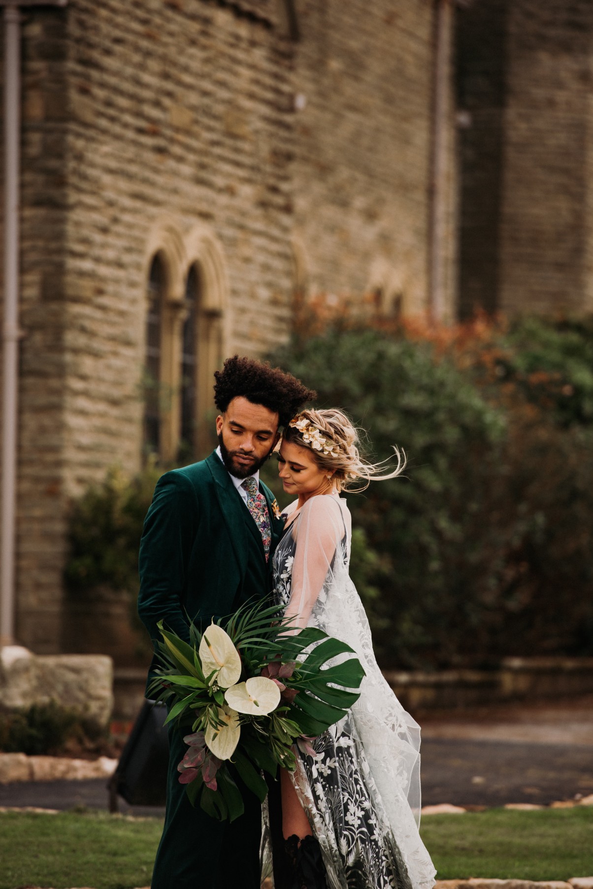 How incredible do this couple look? The groom is rocking a bottle green velvet suit and floral tie from Dandy Threads. This badass bride is gorgeous in her black and white flare sleeved wedding dress from Bexbrides, with EPIC knee high lace boots from House of Elliot. Wedding Hair by Kirsty and Heavenly Beauty worked their magic on hair and makeup, making this pair look unstoppable! Both are wearing accessories by Garter And Veil, including a bespoke gold lapel piece!