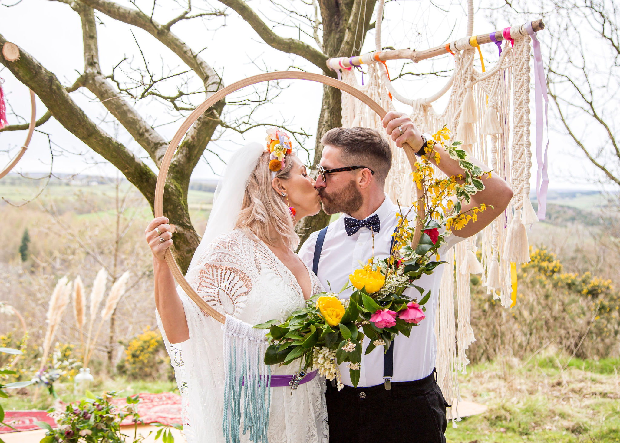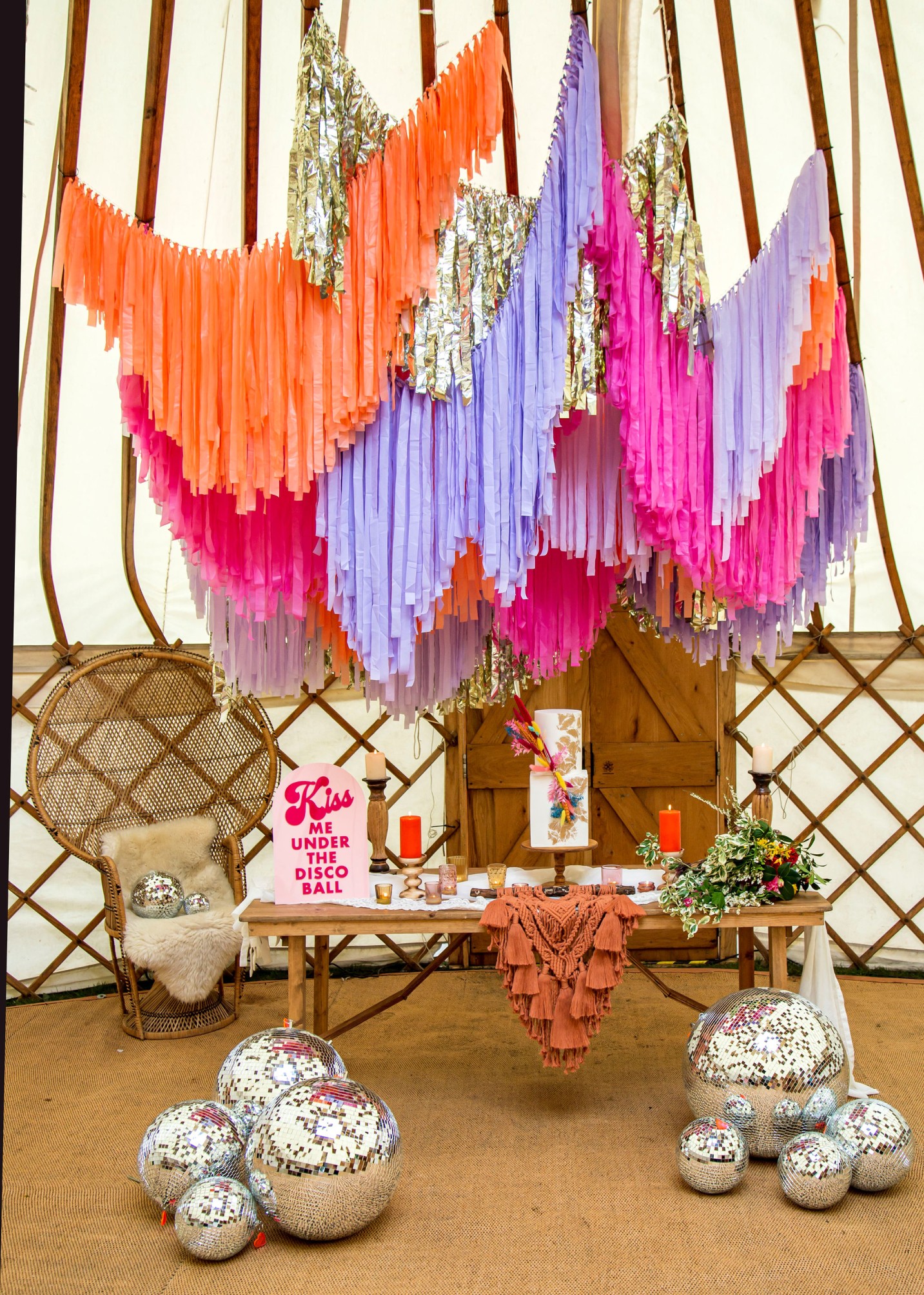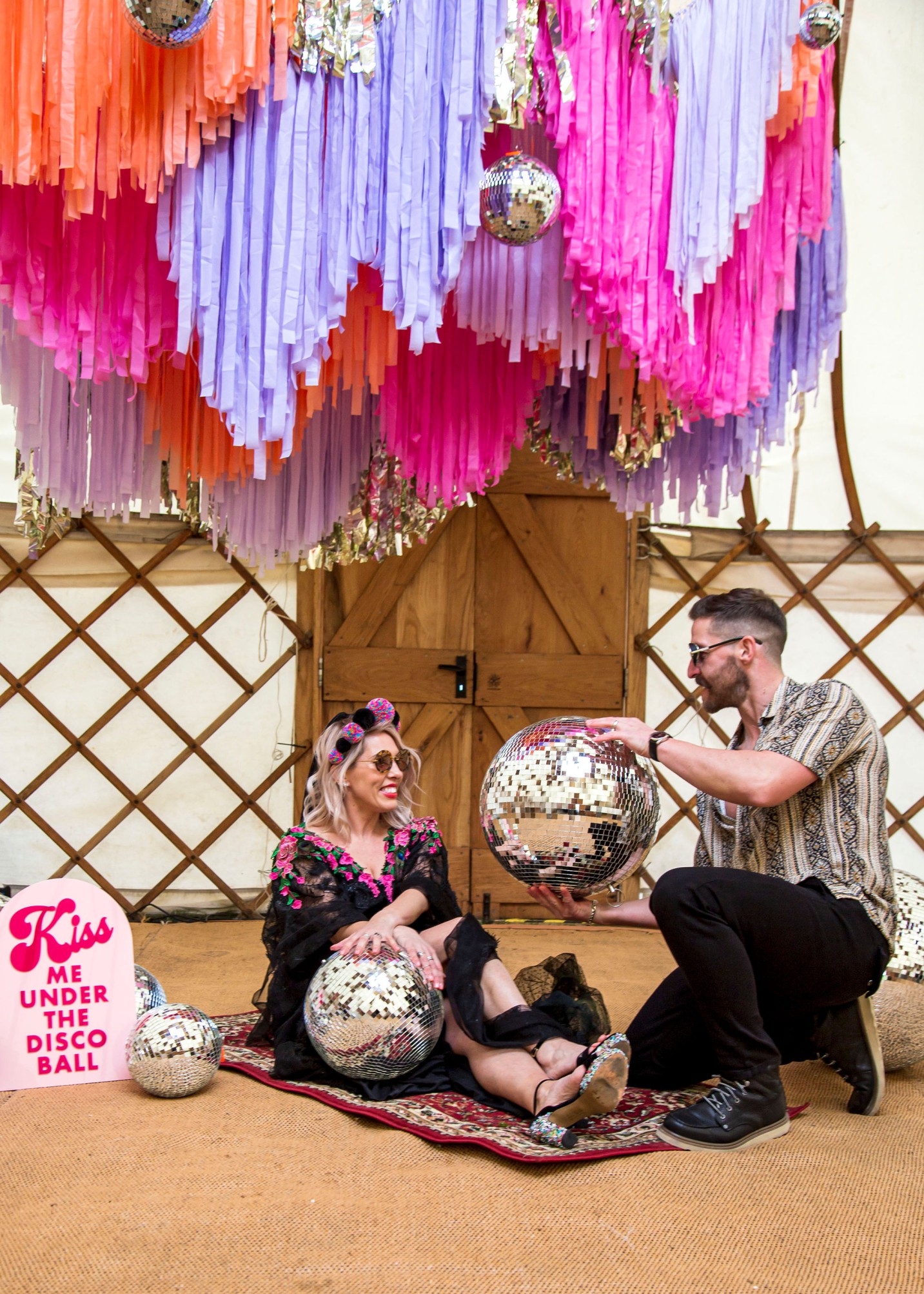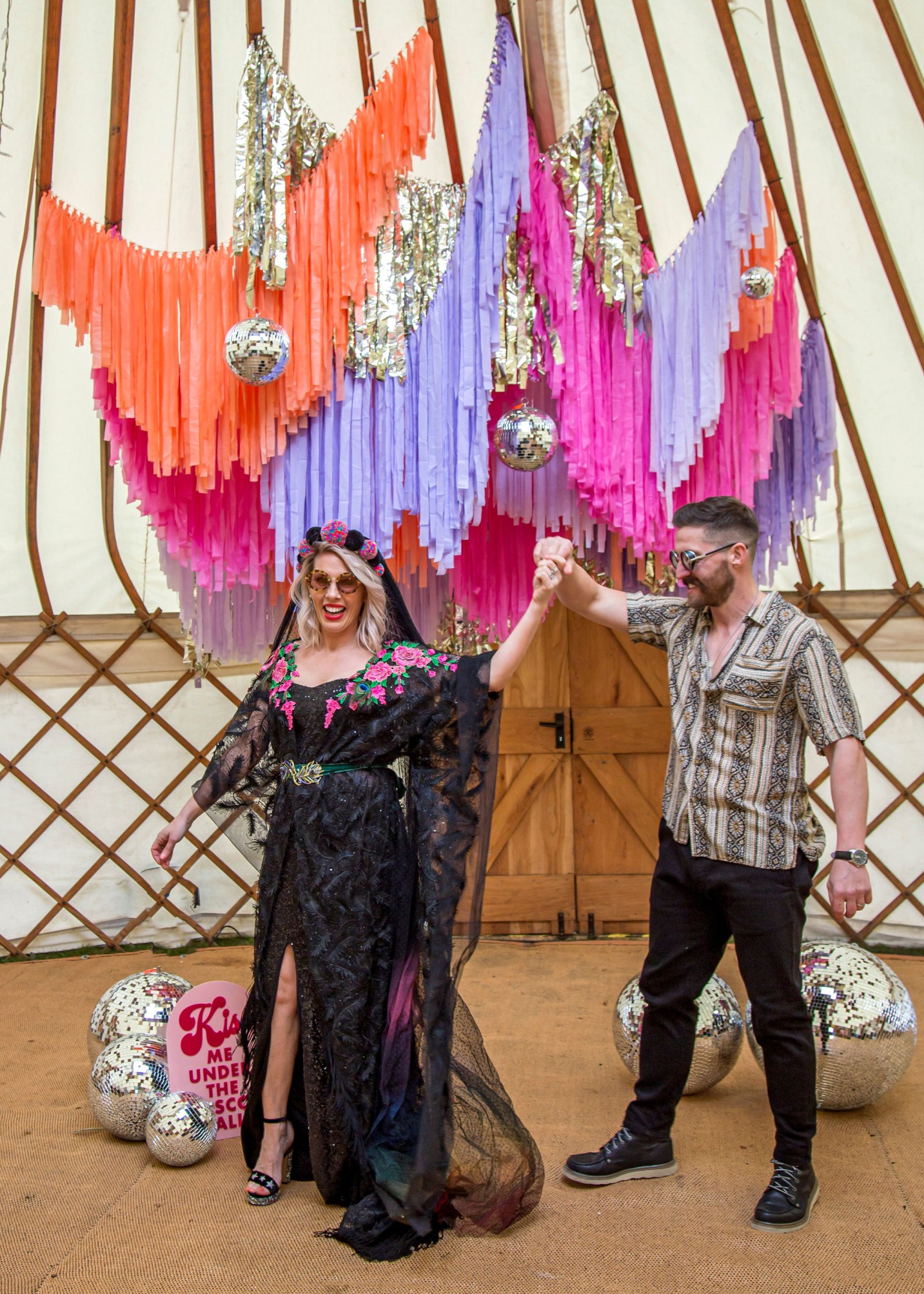 What happens when you combine a bohemian festival with bright colours and a bit of sparkle? You’re about to find out! This disco festival wedding inspiration is a colourful outdoor wedding and yurt reception, all planned with an eco-friendly ethos and a bohemian soul. These gorgeous photos were sent to us by Daze Photography and Film – we think you’re gonna LOVE this fun and free-spirited wedding style.