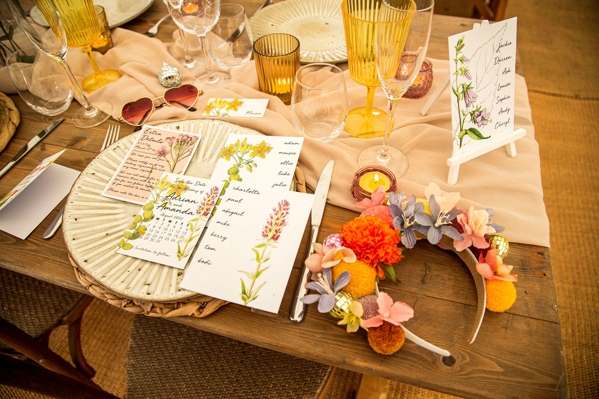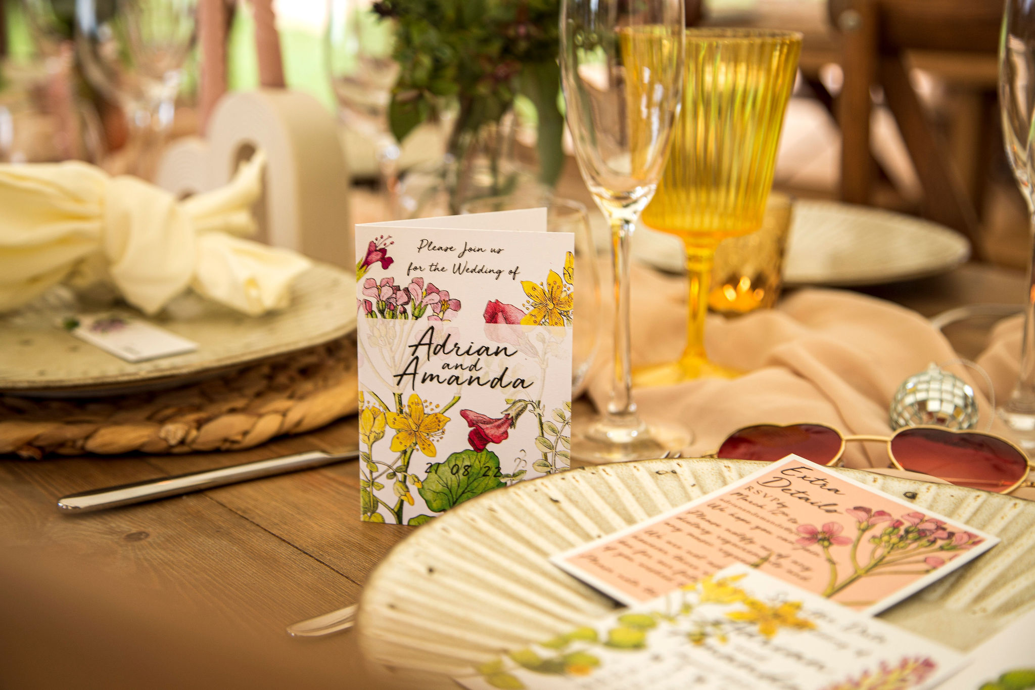 This bohemian wedding stationery was designed by Made By Mudd, with the colourful wildflowers fitting the theme perfectly. The table sign really helped bring the outside into the yurt and worked brilliantly with the surroundings.