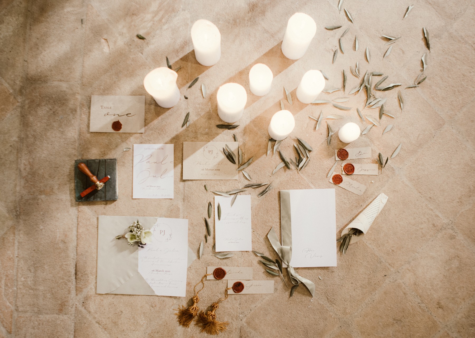 This Italian wedding ceremony took place at San Francesco Church in Montone, a historical Franciscan church with a simple, decadent beauty. It was decorated with an abundance of Olive Tree branches and white candles, creating a wistful and romantic energy. The timeless wedding stationery by Lucia At perfectly summarised this classic style. For the perfect photo opportunity, The couple showed off their wedding rings from VM Jewelry Design on vintage-style tiles by Cotto Etrusco.