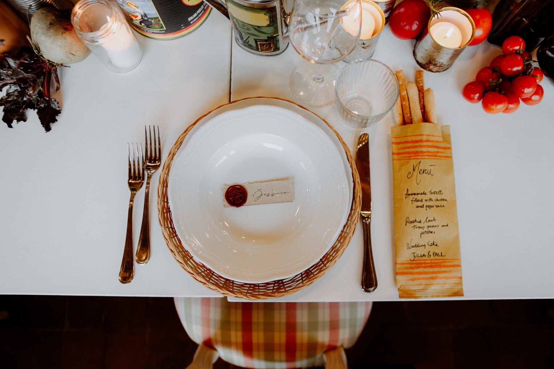 For a wedding reception with a difference, This Italian wedding embraced the Umbrian culinary tradition, creating a ‘back to basics’ style celebration at Il Buiolo. Both LMents and floral designer Alberto Menegardi created this Italian wedding table spread, challenging themselves to create something in which the flower is not the main element. Instead, they used staple Italian ingredients as centrepieces, creating a homely feel.