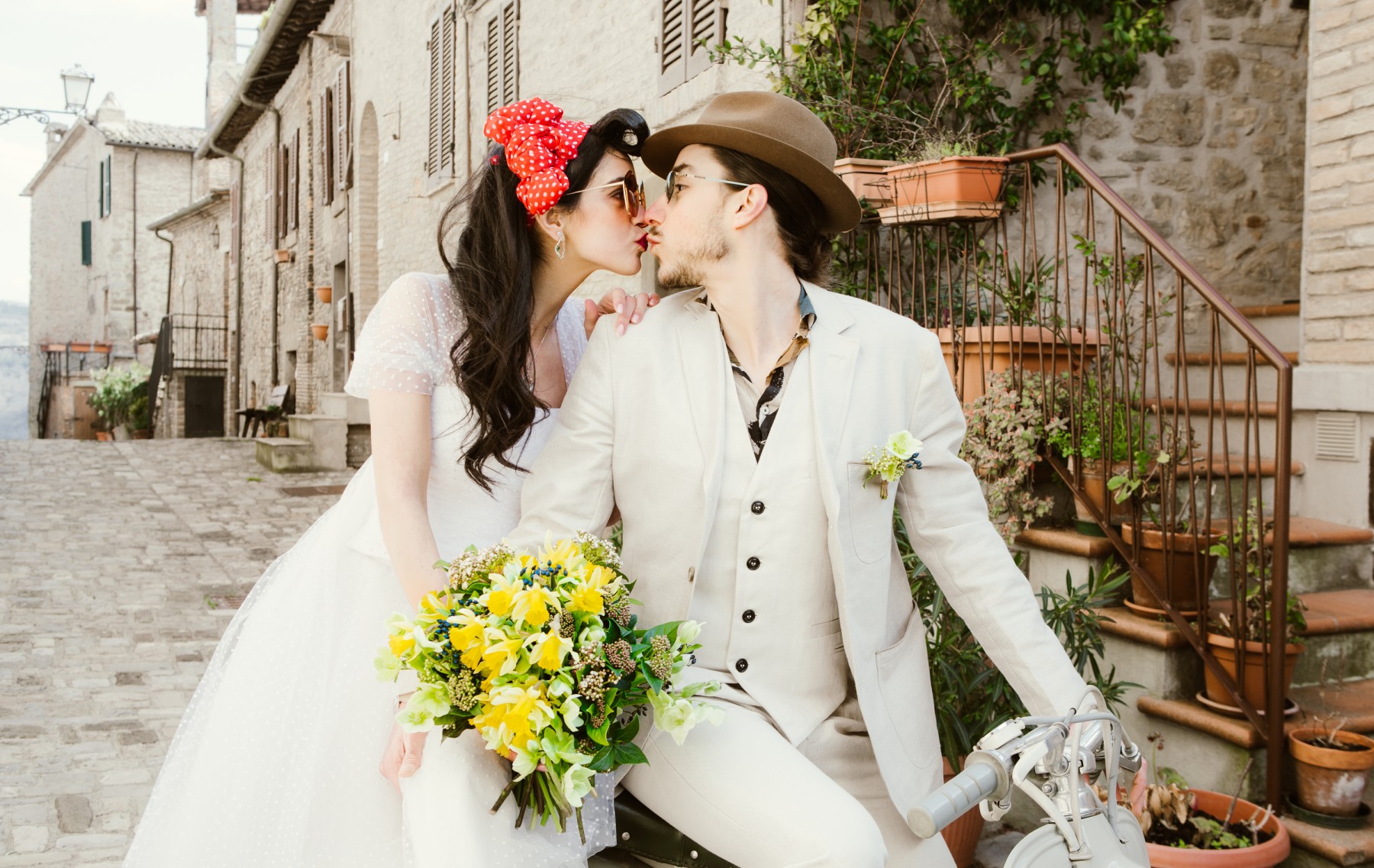Why have one wedding look when you can have two? After the ceremony, the couple changed into retro-inspired wedding wear to hit the streets of Montone, a beautiful mediaeval village in Umbria. Both wedding dresses are from Chiara Vitale, each with their own special Italian elegance. Visage Studio Estetico created the makeup looks and 50 Sfumature di Colore completed the look with beautiful hair styling.
