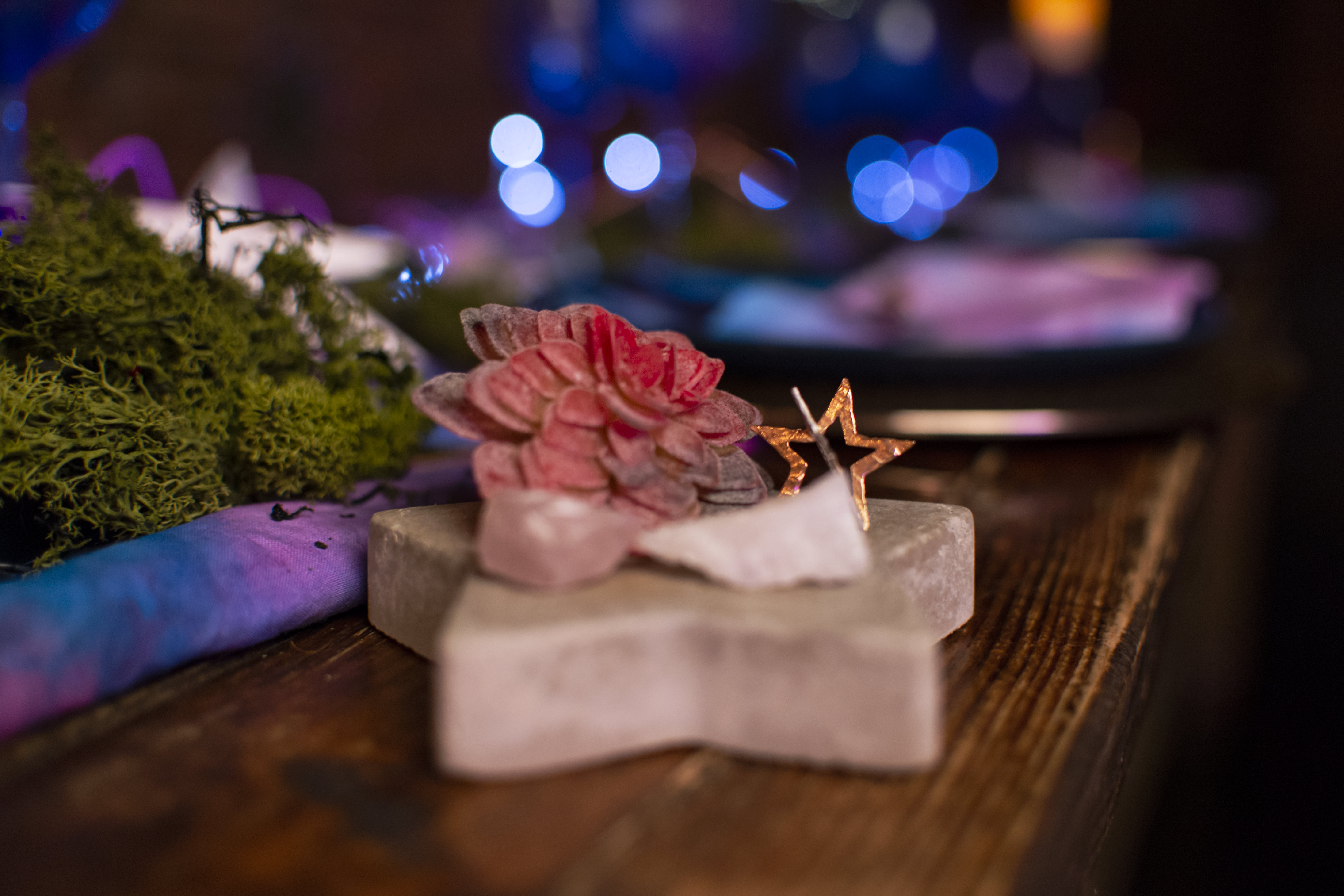The table was brilliantly styled by The Wedding Alchemist. I LOVE this tie dye tablecloth with the matching napkins- they look like galaxies, especially with the little star decorations. The painted glasses are fun touches, adding splashes of colour to the décor. A slight grandeur is added with tall candle holders, contrasting the earthy succulents and moss-like plant decoration. These elements come together in an awesome, eclectic look.