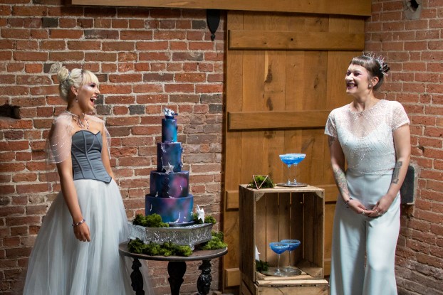 Meg and Suki are rocking the galaxy wedding look, kitted out in beautiful Fiona Elizabeth Couture pieces. We’re all for sustainable fashion here, and love that these two-pieces can be worn again in different combinations. The black lace boots from House Of Elliott look awesome on Meg with the pink tights that peek out from under the skirt- very 80s! Suki wears upcycled heels from The Amber Room, embellished by CRZyBest to compliment her wedding bouquet. Upcycling is a great way to add personality to your wedding, and to breathe new life into something pre-loved!