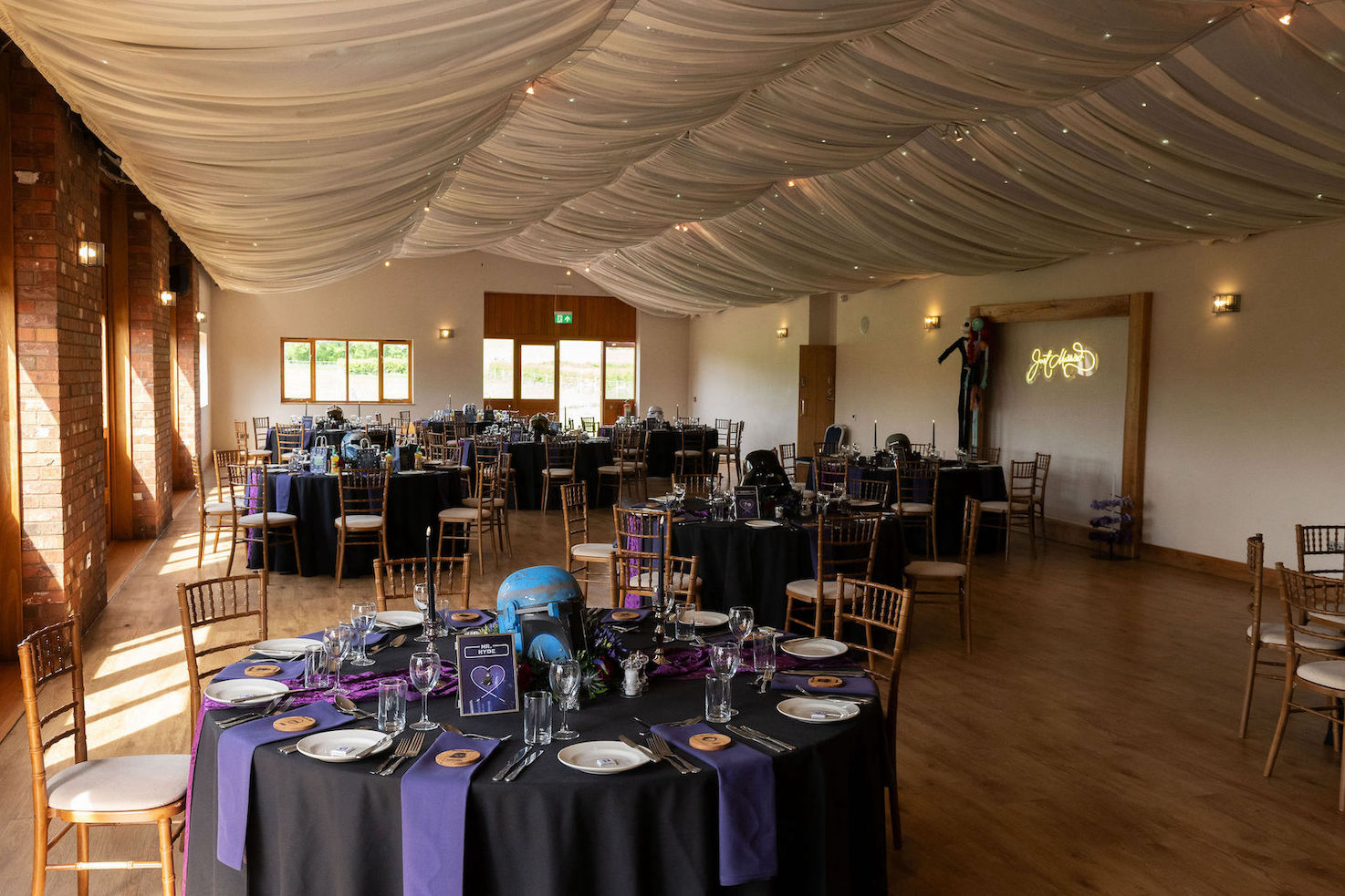 The Wedding Breakfast was held in the beautiful barn where the tables were styled by Foxglove and Black with Star Wars Helmets, purple velvet runners, coordinating flowers and homemade wooden coaster place settings. A galactic themed table chart (also by Foxglove and Black) directed the guests to their Nightmare Before Christmas named tables.