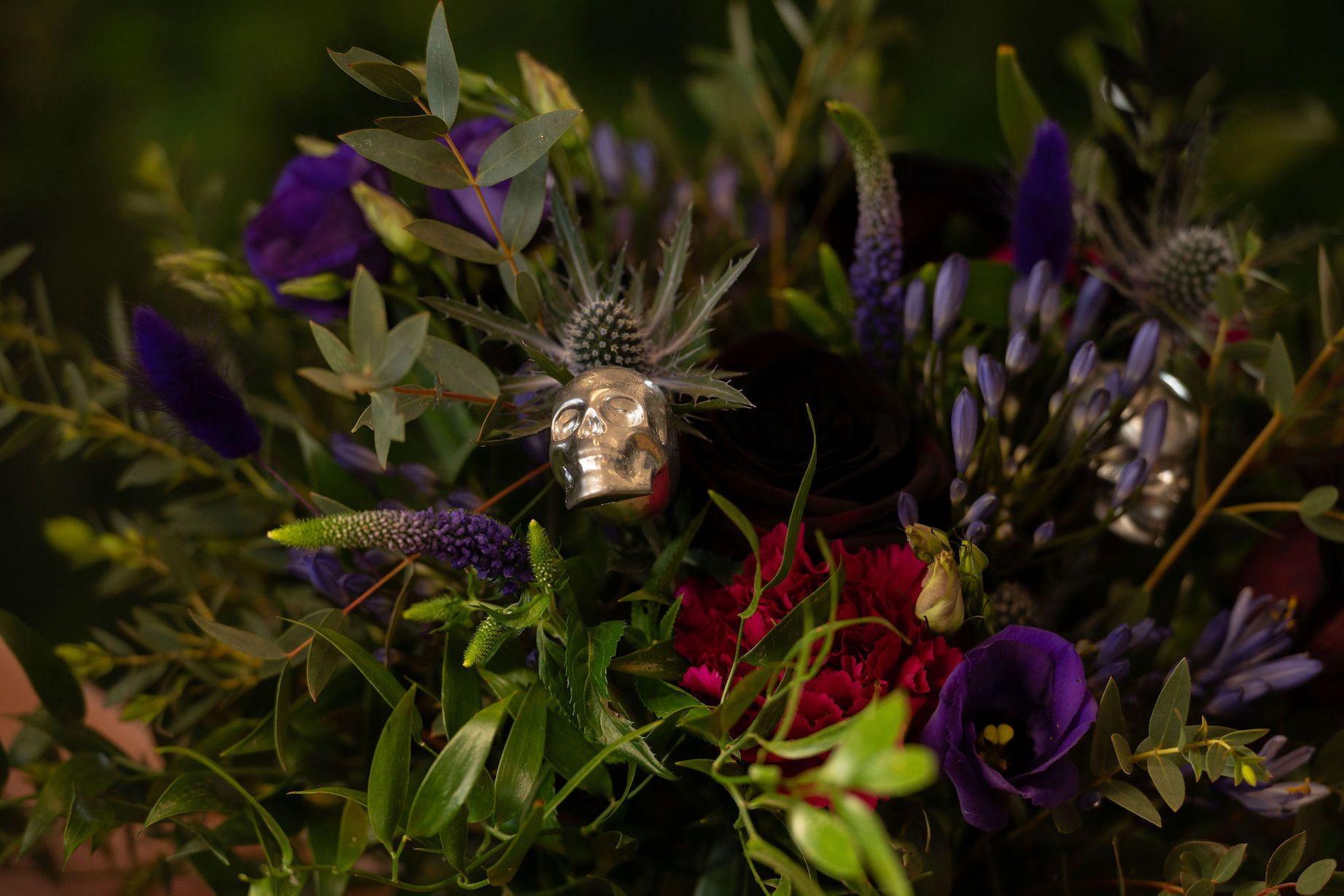 Chelsey carried a stunning textural bouquet of blues and pops of crimson with in a lightsaber hilt provided by Foxglove and Black. Silver skulls featured in the bouquet as a nod to the ‘Nightmare Before Christmas’ theme.