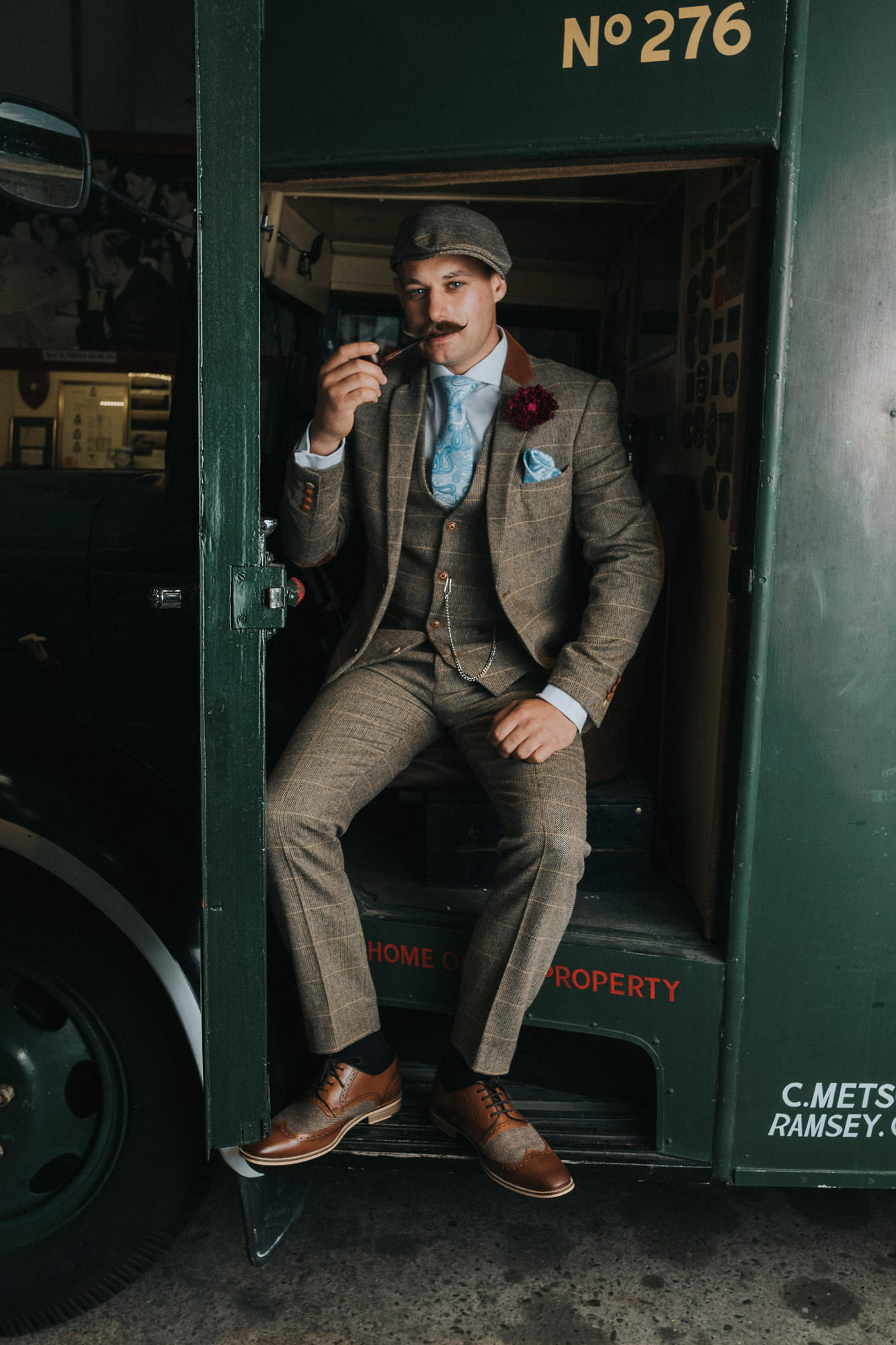 The beautifully tailored suit for the groom was provided and styled by the (suitably named) Fallen Hero, with a fabulous flat cap to top it off. Check out the groomβs incredible moustache!