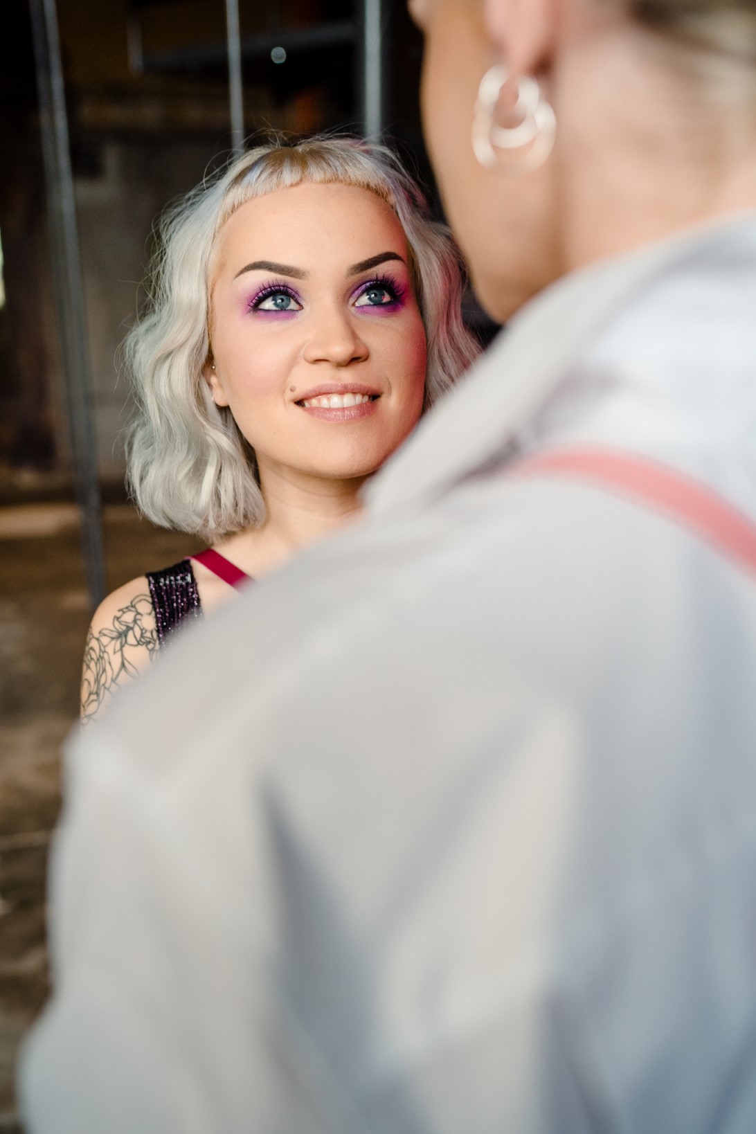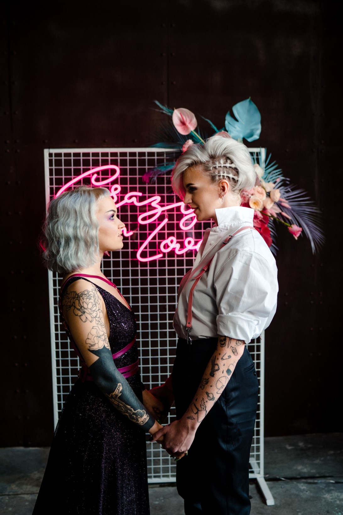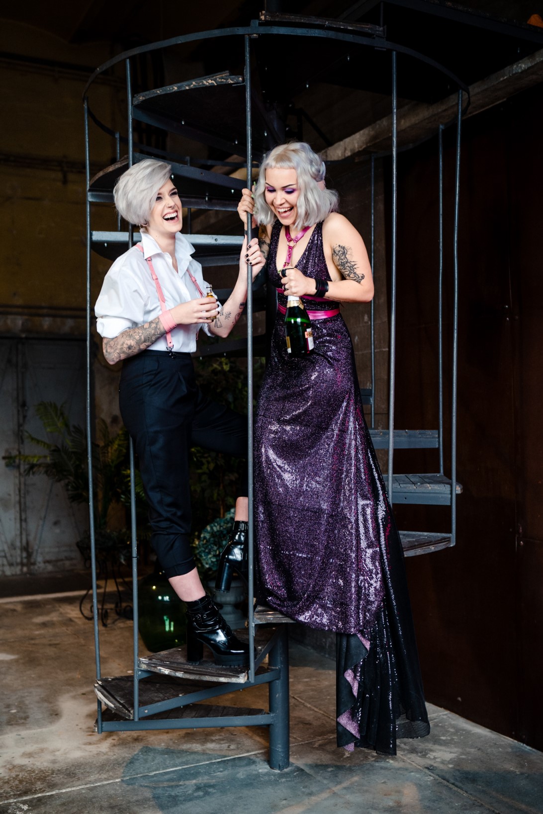 Donβt these two brides look fabulous? Theyβre both rocking individual wedding looks. I adore that theyβre challenging convention by wearing what makes them feel amazing, reinforcing the powerful message of this shoot! Allisonβs sparkling dress is from Coil Budapest, paired with Dr Marten boots to add her personality. Β Lauren wears a Mohito suit with Zara blouse, rocked up with killer heeled boots, a popped collar and pink suspenders. Β Also, how cool is this personalised jacket from Ophelia Rose Hand Painted?