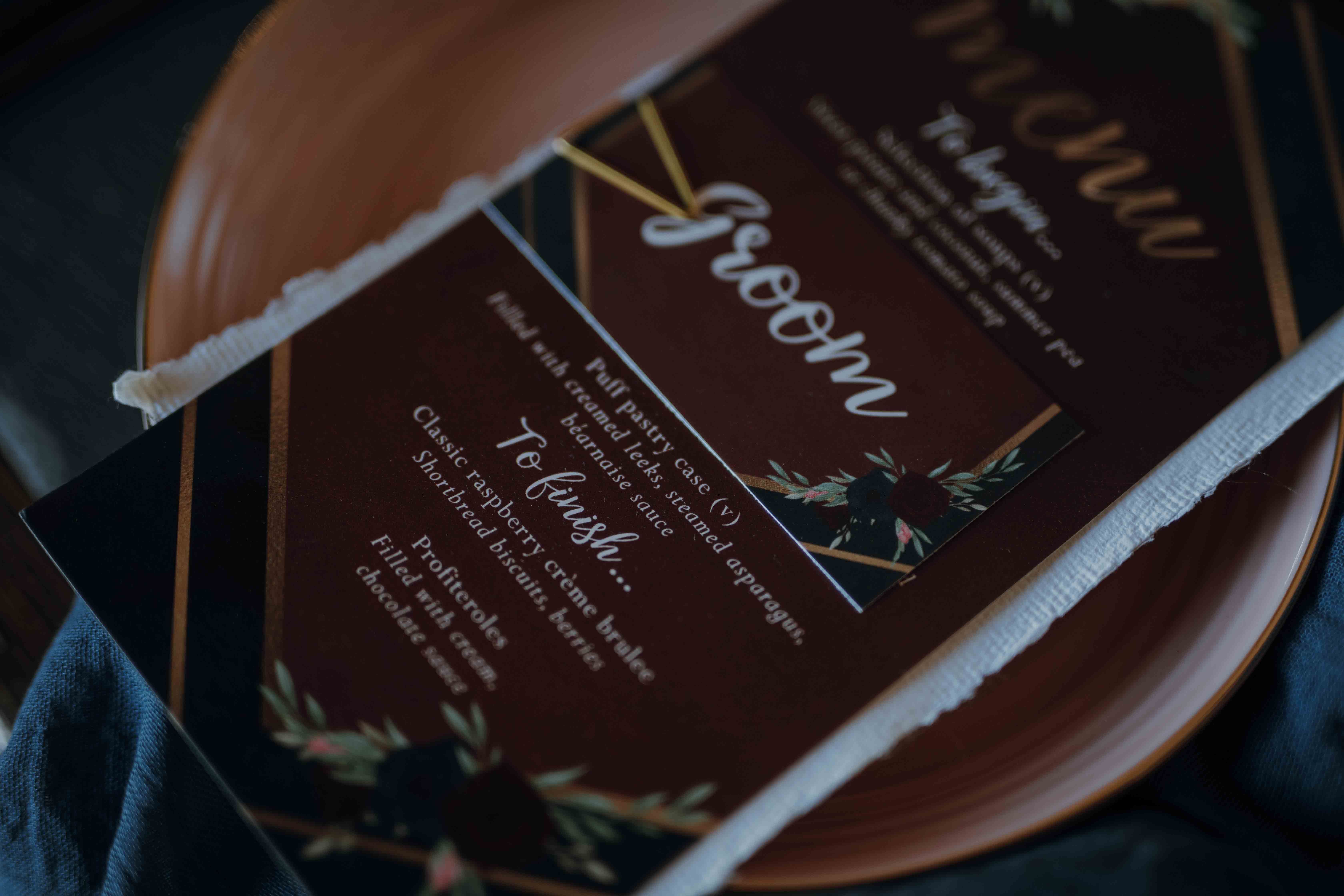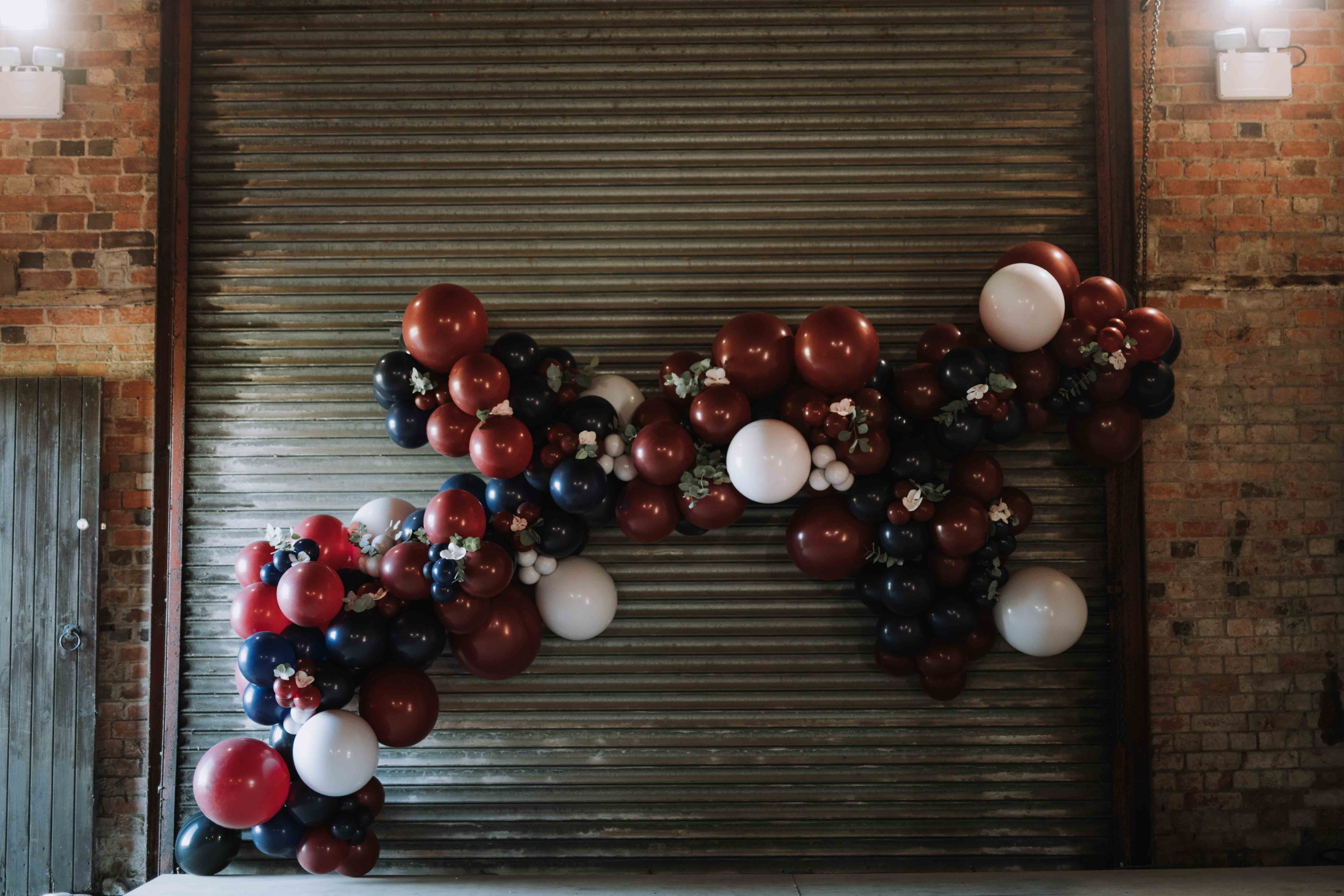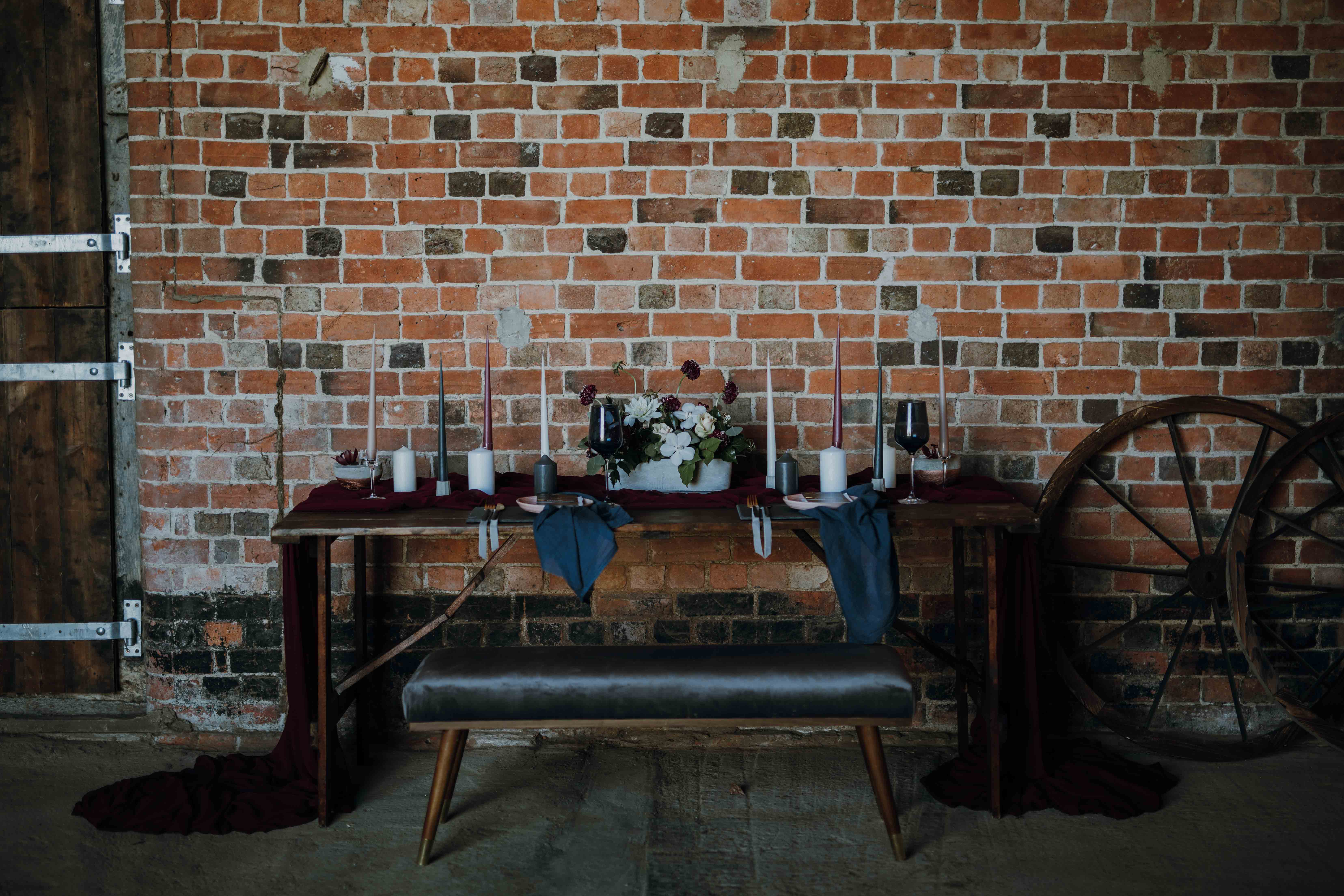 Deep, regal colours like burgundy and navy always look warm and sophisticated, especially in an industrial venue.