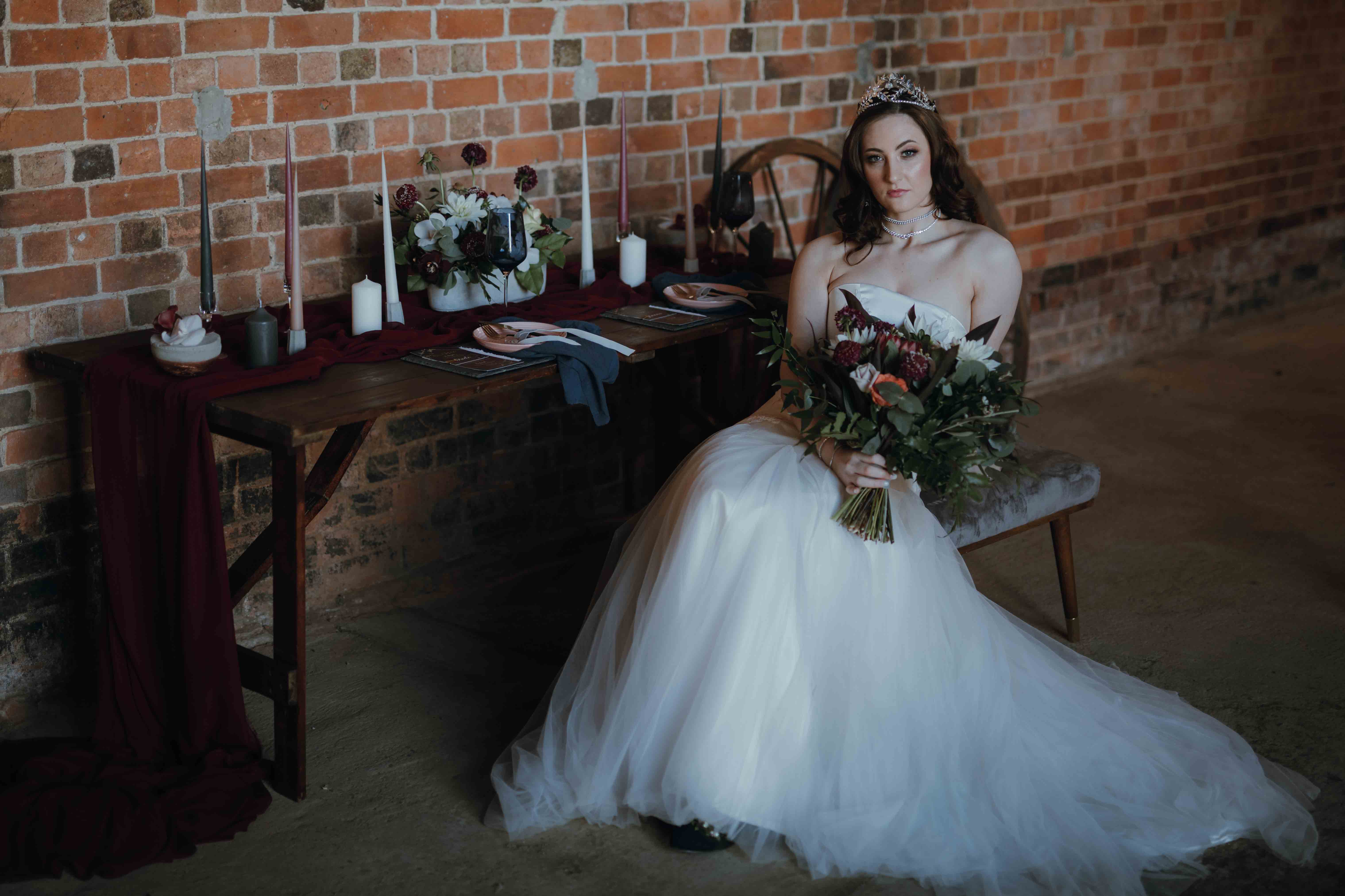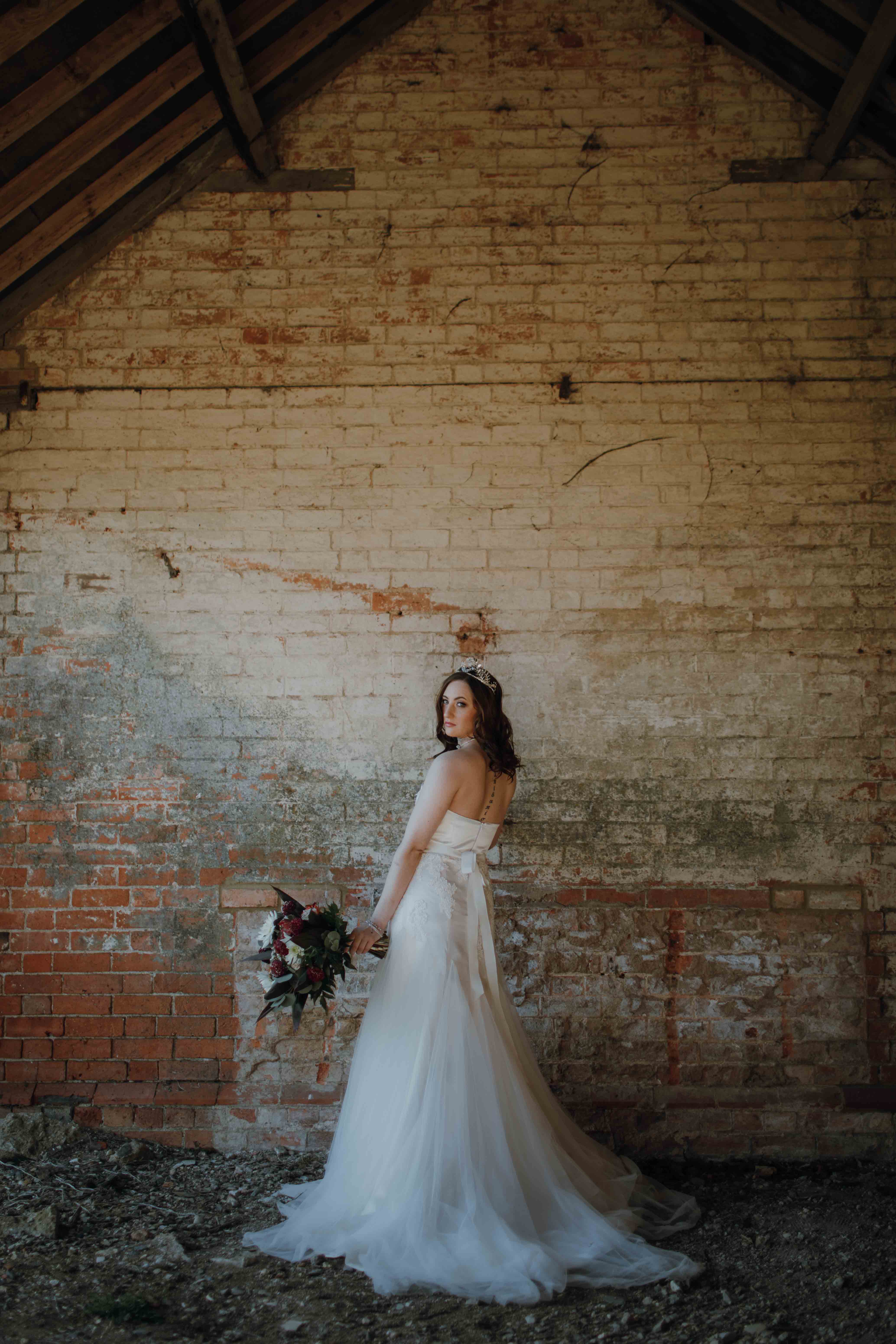 The great thing about industrial wedding venues is they can be blank canvasses. You can decorate to suit your personality, with the ‘raw’ feel of the venue adding an unconventional twist. This shoot demonstrates two bridal looks – one is minimalistic and modern with crisp clean lines whilst the other features a bold skirt and delicate detailing. The makeup has been kept glowing and minimal to enhance the bride’s natural features and both hairstyles are glossy and elegant.