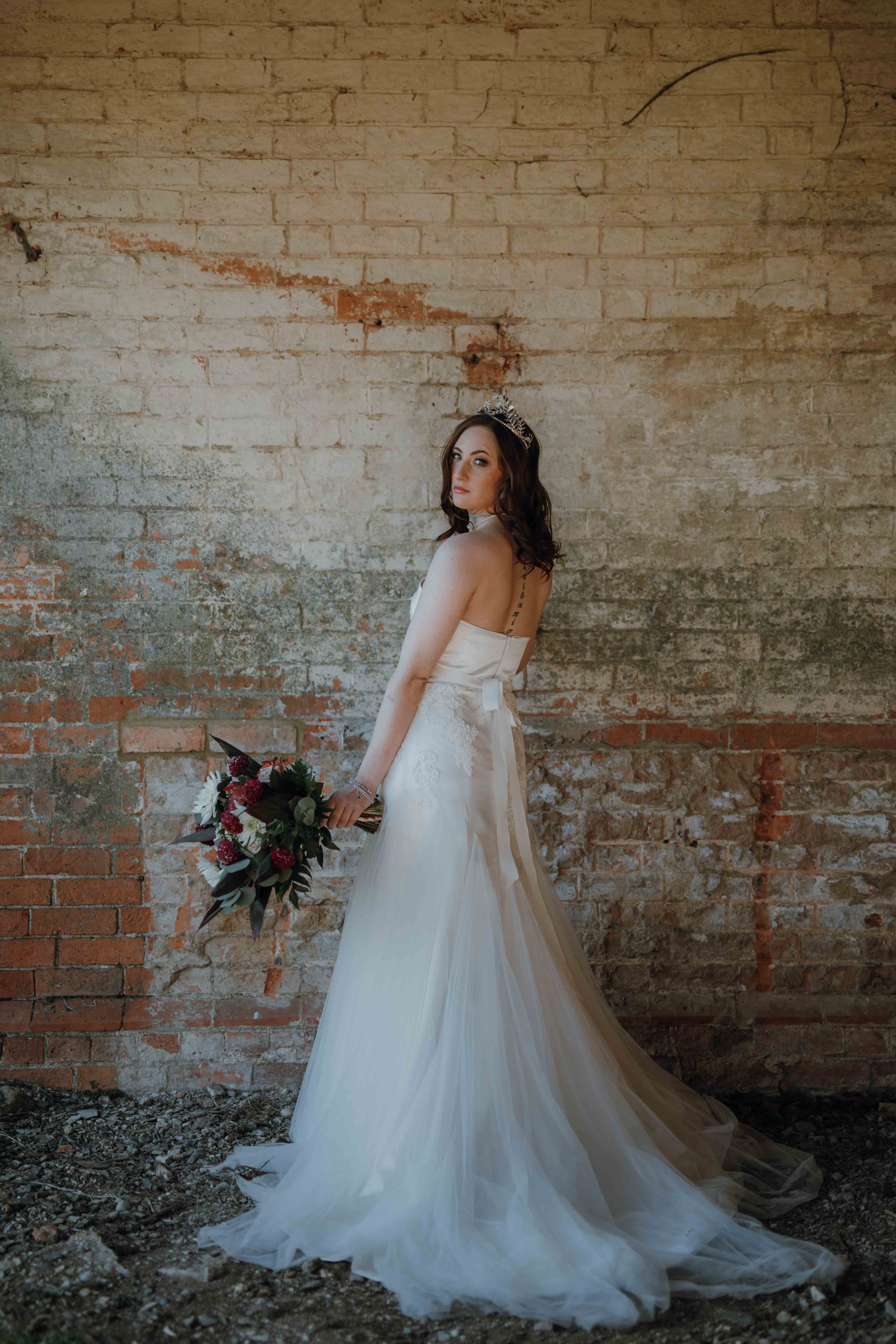 “This black sheep bride didn’t want to abide by traditional formalities. We made use of industrial, raw and worn surroundings, draped with clean, urban decorations and a beautiful model with a whole lot of attitude. ‘Princess gone Rogue’ sums it up pretty well!”