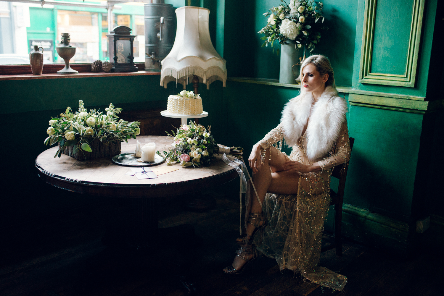 Ok so you know that if you send me something glittery and shiny I’m going to be pretty excited straight away. And there was no exception for this Art Deco wedding inspired photoshoot. Inspired by the Great Gatsby, it blends together modern, minimalist and metallic trends with the Art Deco style. It’s sleek, sexy, and elegant, with expensive taste. Just perfect for modern couples that are not scared to try something different a unique as it was shot in the local pub!