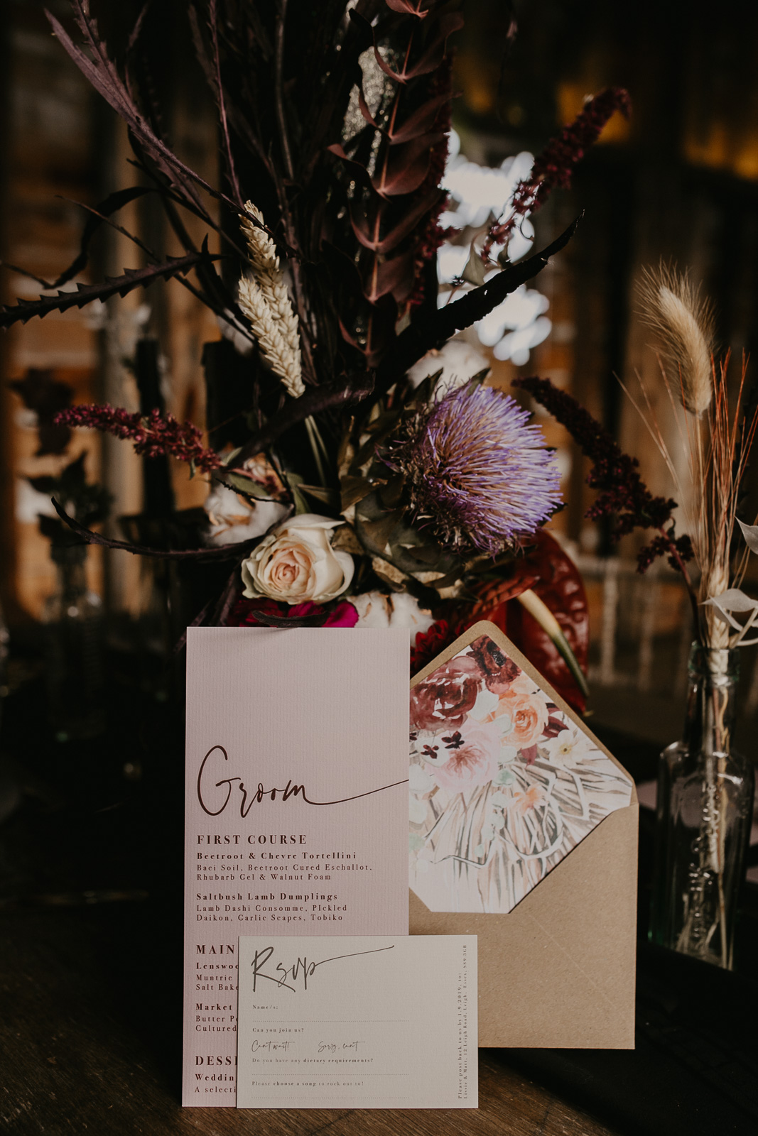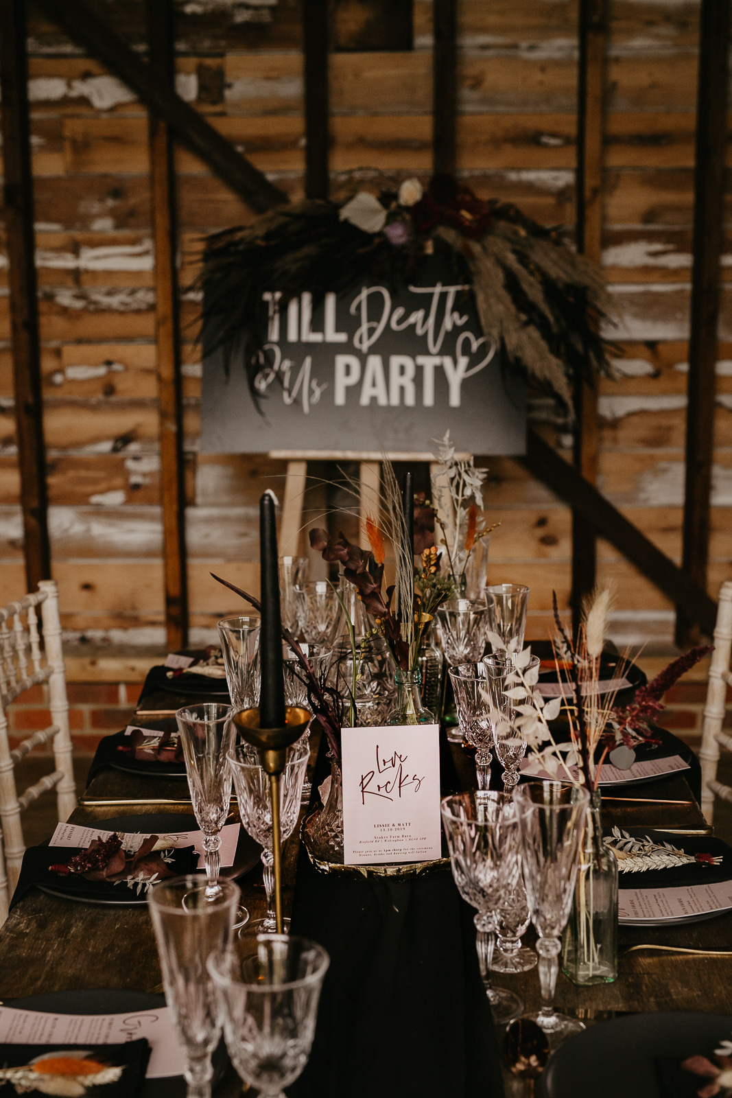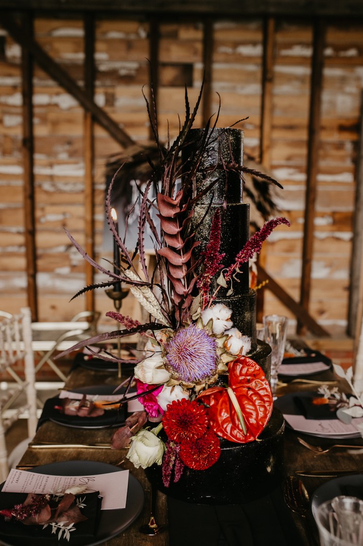 Two Little Birds styled this modern barn wedding shoot, and created the floral displays! They used a unique combination of stems and dried leaves, with both muted tones and bold flowers. We are LOVING the neon sign- perfect for photos! The sparkling black wedding cake by Avantgarde Cake Studio is a real statement piece, reinforcing the modern styling elements and tying the colour schemes together. There are a few black pieces in this shoot, including the plates, candles and table runners. Whilst this shoot has stayed true to some traditional elements, we love how the black items challenge ‘white wedding’ stereotypes whilst adding an edge to the look. The gorgeous floral stationery by Wonderland Invites balances ‘rustic’ with ‘sleek’ to create a clean and modern design.