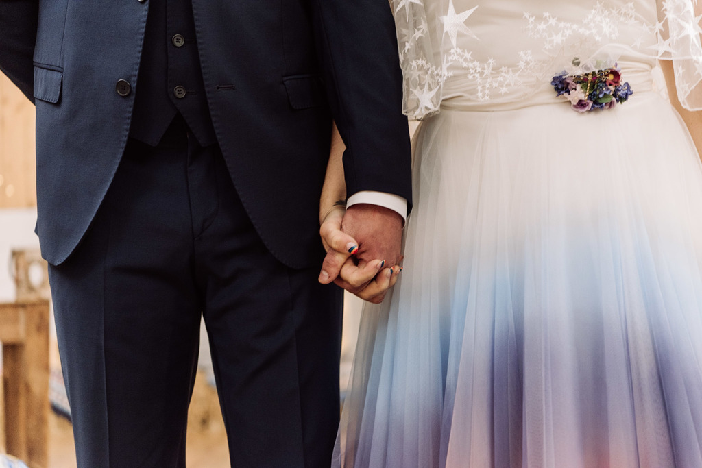 This ombré wedding dress from Bexbrides is gorgeous, especially paired with the starry cape! It is beautifully paired with Lace And Love heels and accessories by Honey Blossom and Starbox. The makeup, by Rachael Doig Makeup Artist, is kept glowing and natural with a pink shimmer to emphasize the eyes, with a loose fishtail plait in the hair. Even the garter (by Extra Special Touch) matches the theme, ombré dyed with sunset colours. To top off the look, the bride’s nails were painted rainbow by Miss Nails.