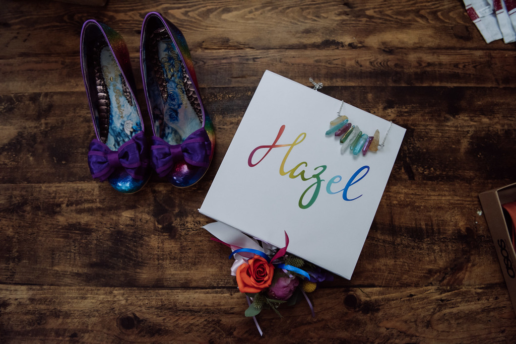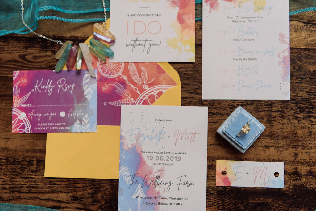 The wooden tables were made into a rainbow dream with different coloured napkins (by The Embroidered Napkin Company), colourful plates and iridescent cutlery and glasses. The stationery by Sugar Crush Wedding & Event Stationery matches the ombré wedding vibe perfectly, photographed alongside the baby blue ring box from Love Lours.