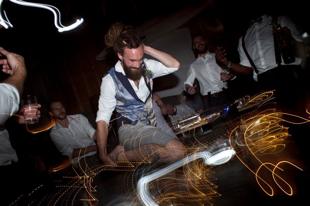 Afterwards the party continued at the nearby farmhouse. It was decorated with surf boards to remind the couple of their times travelling in South Africa. One of the bridesmaids sketched pictures of the wedding guests as wedding favours and there was no wedding cake! Instead a three-tier giant cheese cake (now thatβs my kind of wedding!).