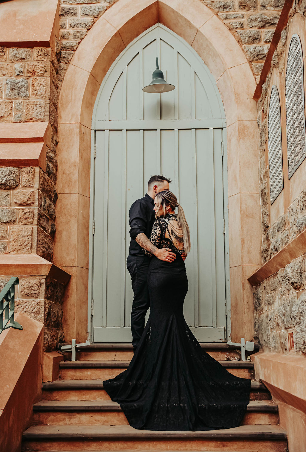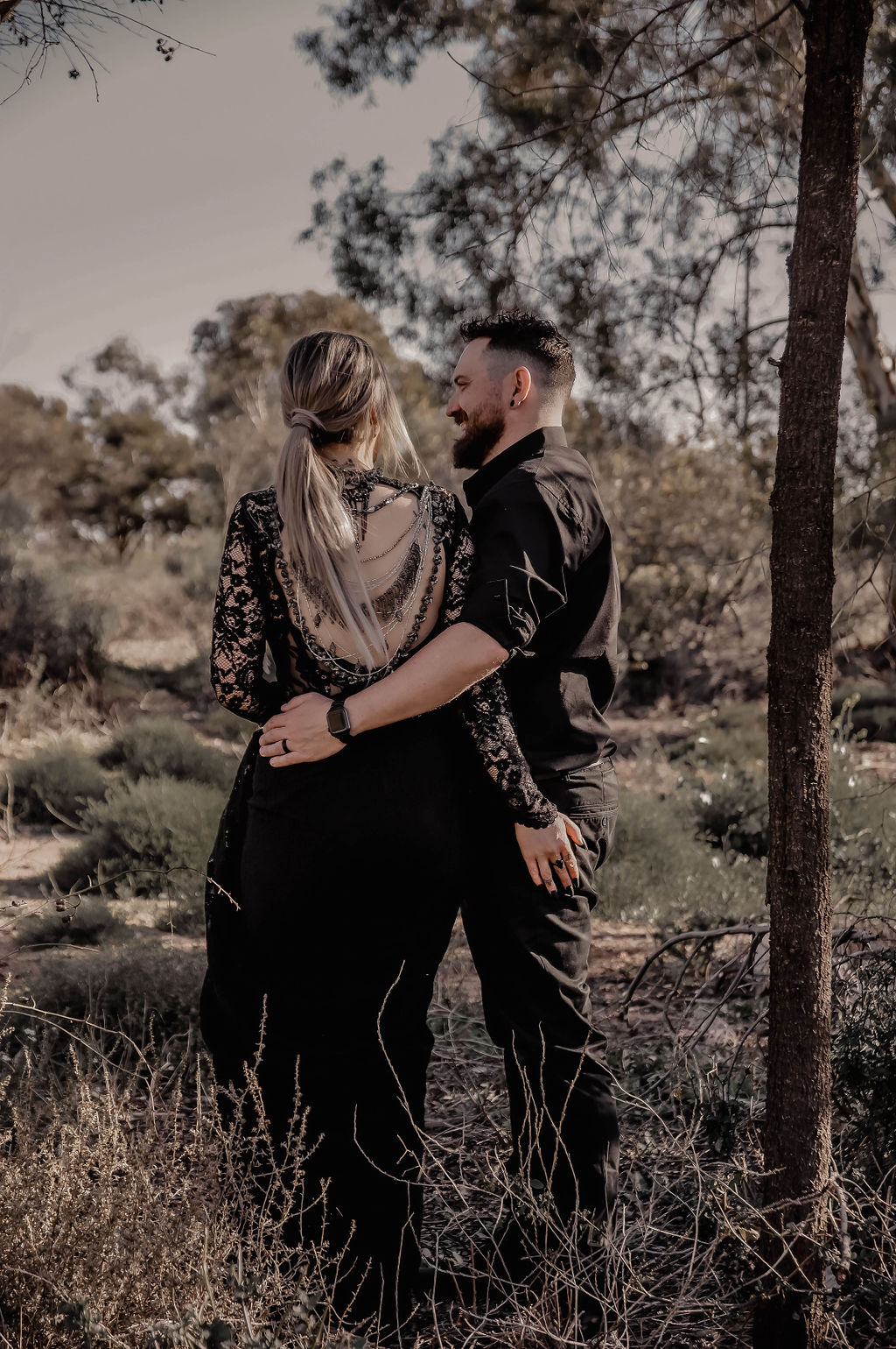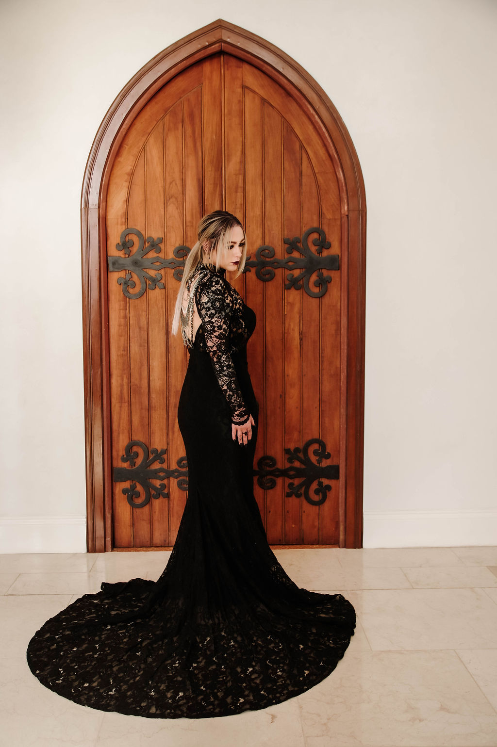 This black wedding dress is an absolute show-stopper! Shannon brought herself a black dress as a base and then altered it to make it her own with the help of a local dressmaker who added the chains across the back.