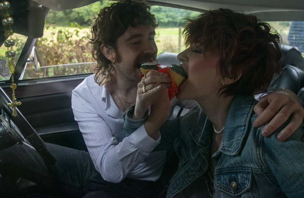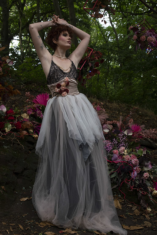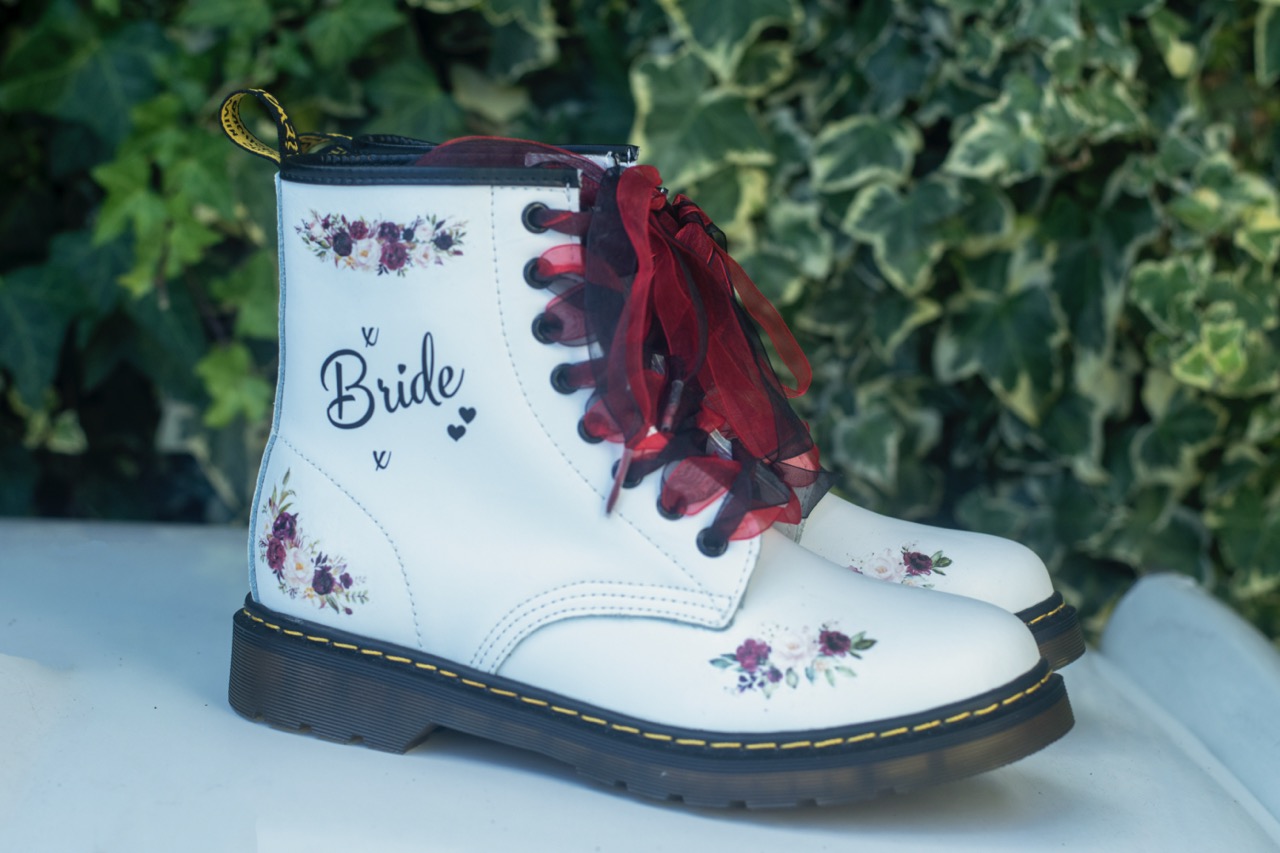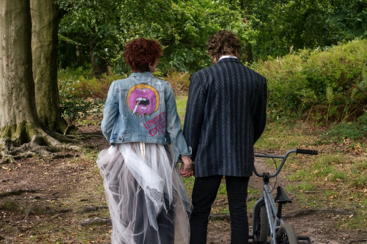 Elegance Hair Design and Selina MUA really absorbed the mood board and transformed Chloe into an 80s bride. Scarlet Tayla handmade this gorgeous, whimsical wedding dress with black and white tulle and a pink fitted bodice. A vintage bowler hat was added for a touch of individuality. Becci Boos Bridal Designs handpainted some 80s-inspired Doc Martens to add to this badass wedding look. Amy Bakerβs Cakes not only created the upside-down wedding cake but also created this handpainted denim jacket! Finally, Charlotte Berry Jewellery supplied the wedding rings for those romantic finishing touches.Β