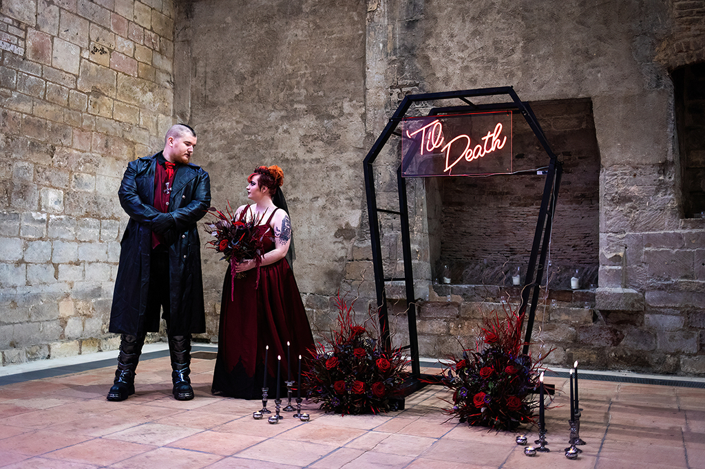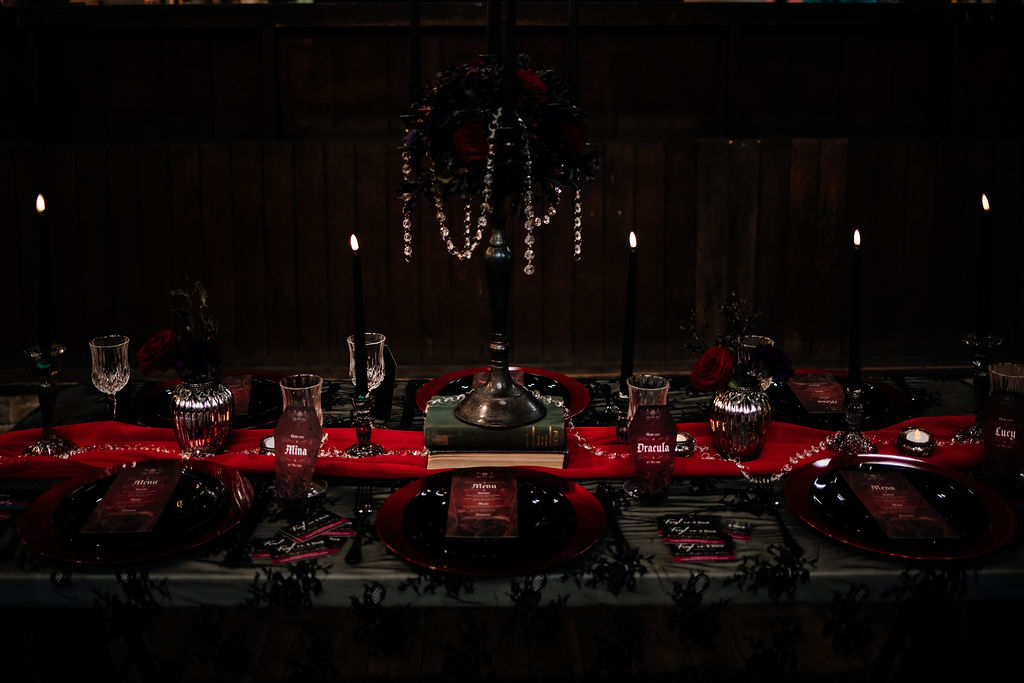 Take for example this Dracula themed wedding shoot which has a black coffin backdrop as its centrepiece. We love the Neon sign to give it a modern twist. Its big, its bold and its totally spooky!
